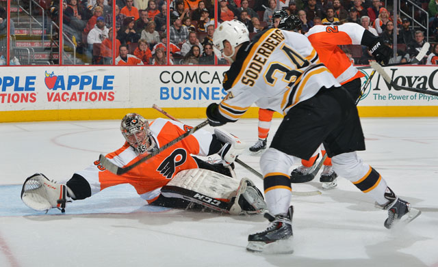 Steve Mason makes a save on a Carl Soderberg shot last year. The Flyers and Bruins face off in the NHL season opener Wednesday night in Boston. (Getty)