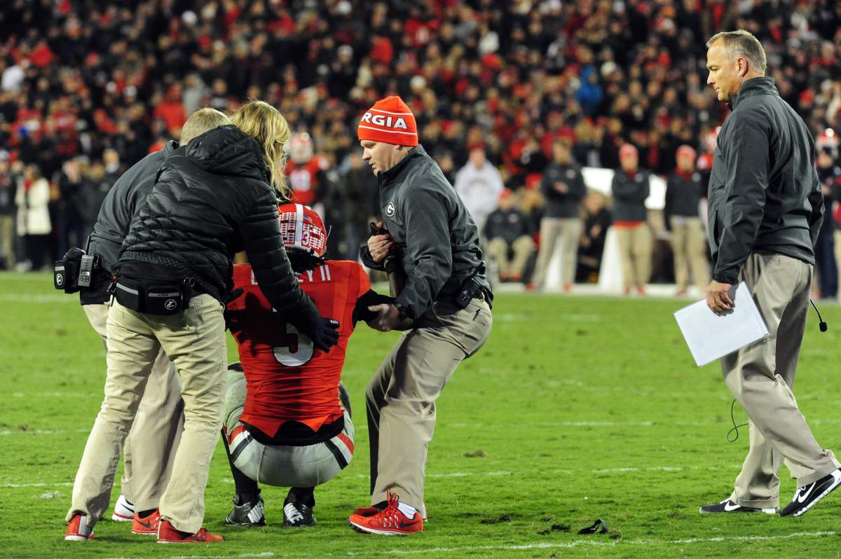 But with just over 5 minutes remaining in the game with Georgia ahead 27-7, Gurley took a handoff on 2nd and 5 and picked up the first down with a 6-yard gain. But he remained on the Sanford Stadium turf in obvious pain. He was helped off the field and didn’t return. An MRI would confirm the ACL tear.