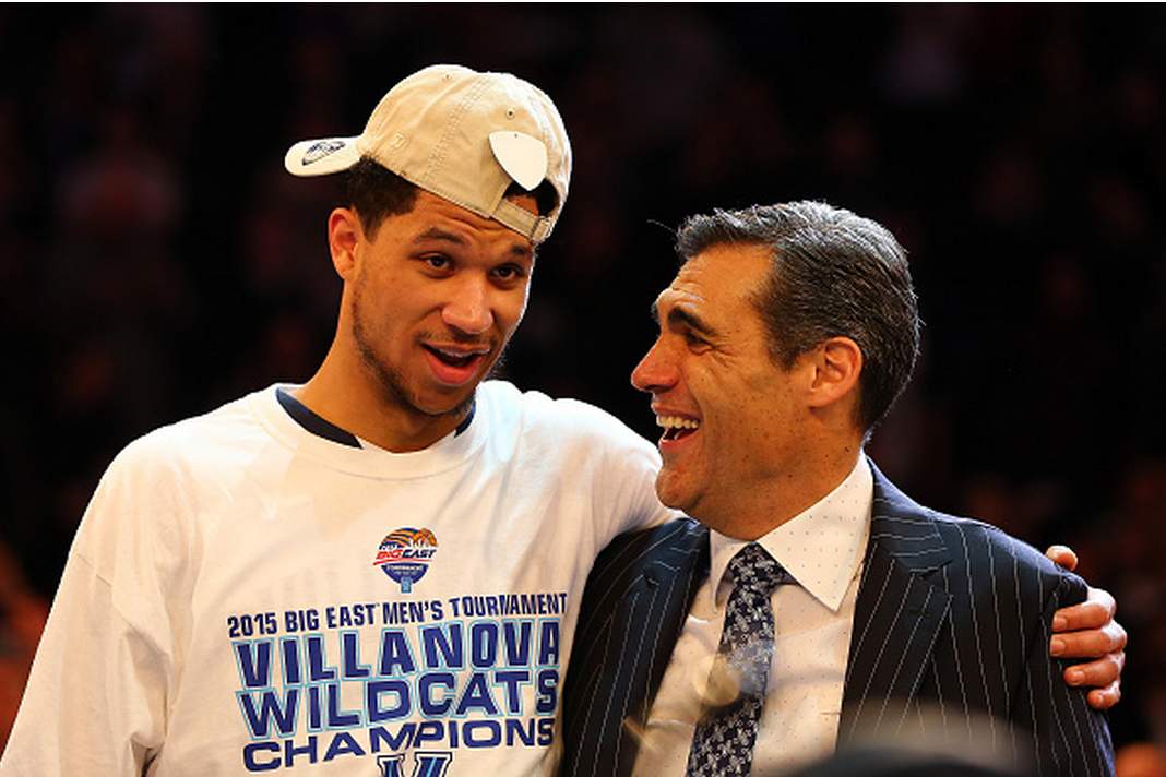 Josh Hart #3 celebrates with head coach Jay Wright of the Villanova Wildcats after defeating the Xavier Musketeers 69-52 in the championship game of the Big East basketball tournament at Madison Square Garden on March 14, 2015 in New York City. (Getty)