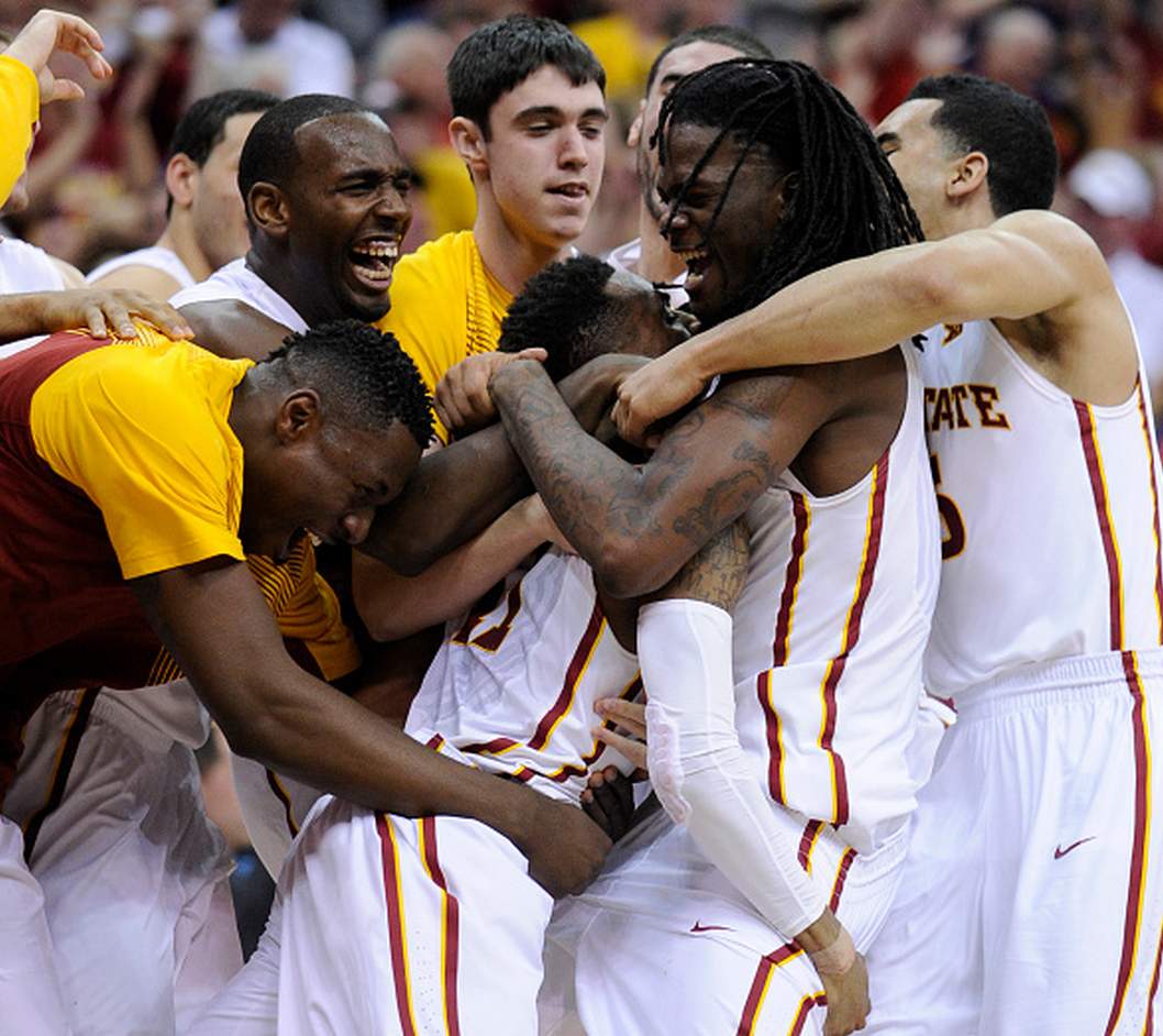 Monte Morris #11 of the Iowa State Cyclones is congratulated by teammates after hitting the game-winning basket against the Texas Longhorns during the quarterfinal round of the Big 12 basketball tournament at Sprint Center on March 12, 2015 in Kansas City, Missouri. Iowa State won 69-67. (Getty)