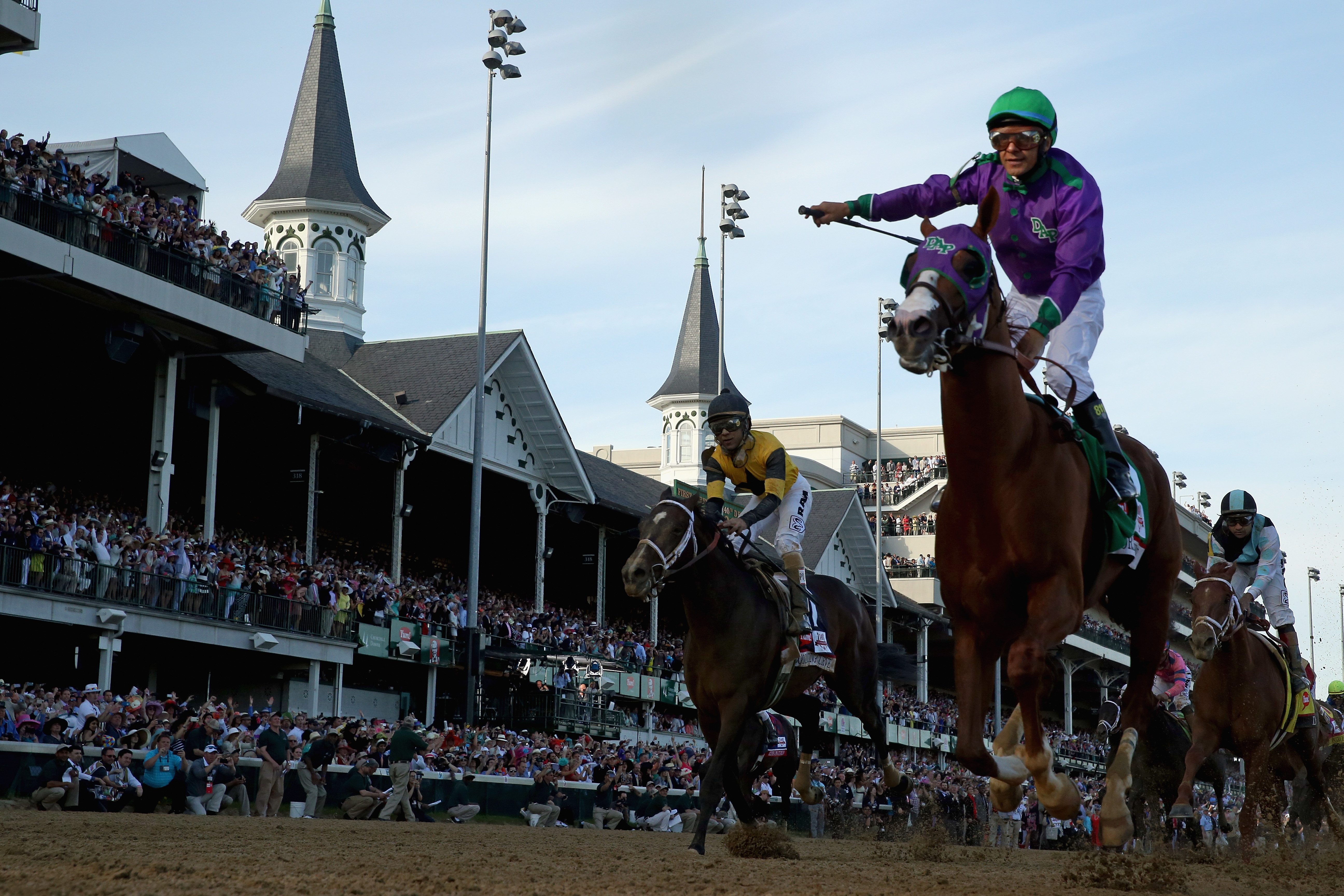 California Chrome crosses the finish line to win the 2014 Kentucky Derby. (Getty)