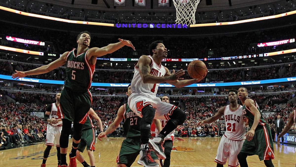 Derrick Rose goes up for a shot Saturday in the Bulls’ playoff win over the Bucks. (Getty)
