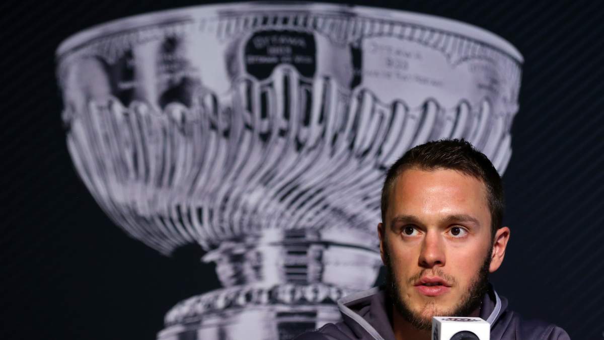 Jonathan Toews speaks to media prior to Game 1 of the Stanley Cup Final. (Getty)