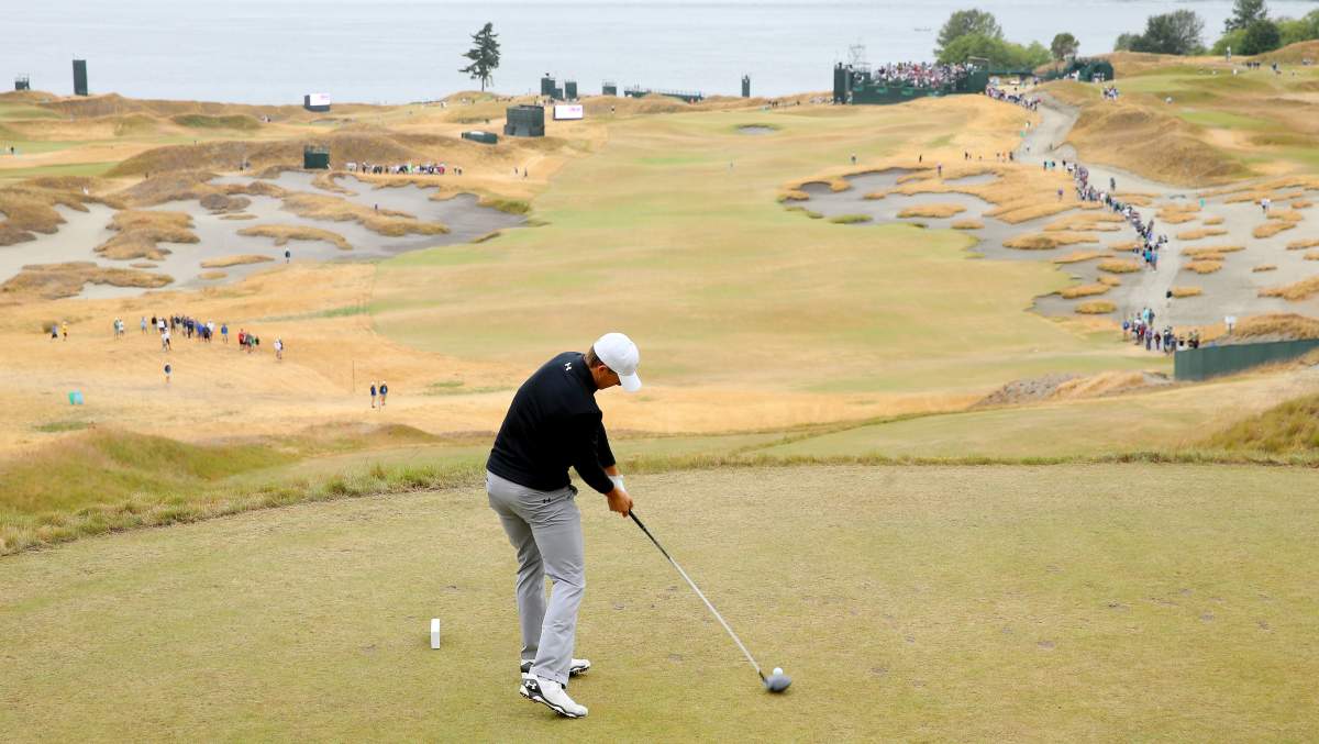 Jordan Spieth tees off during a practice round at Chambers Bay. (Getty)