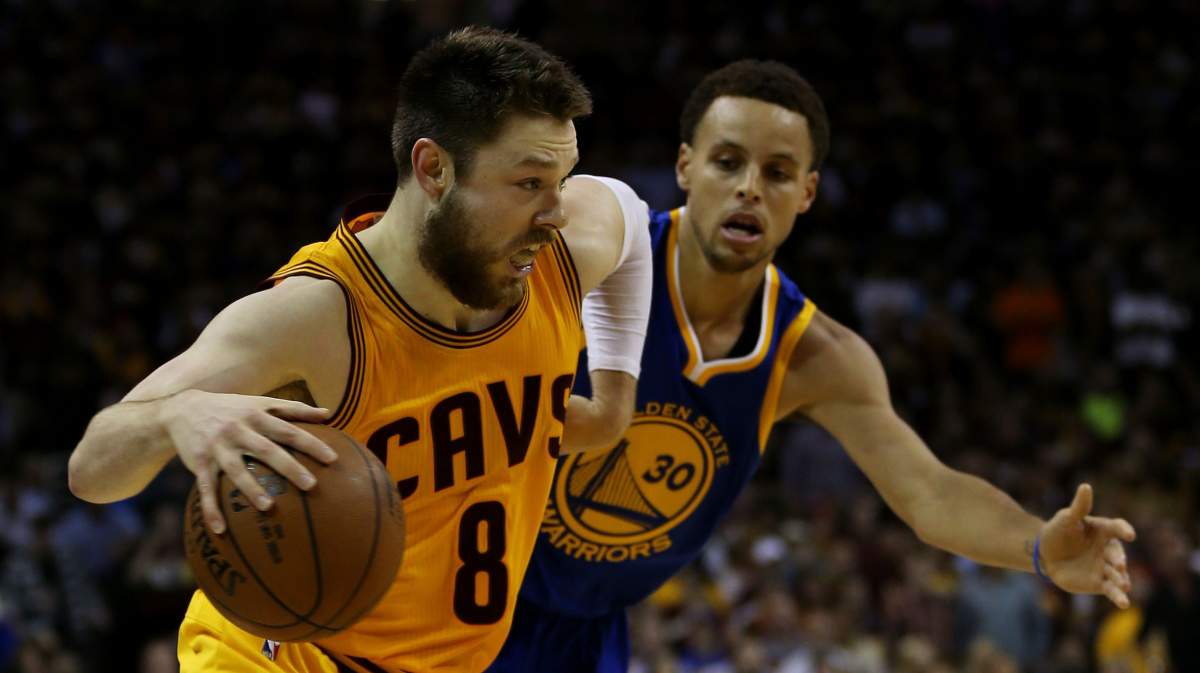 Matthew Dellavedova of the Cavaliers drives against the Warriors’ Stephen Curry in Game 3 of the NBA Finals. (Getty)