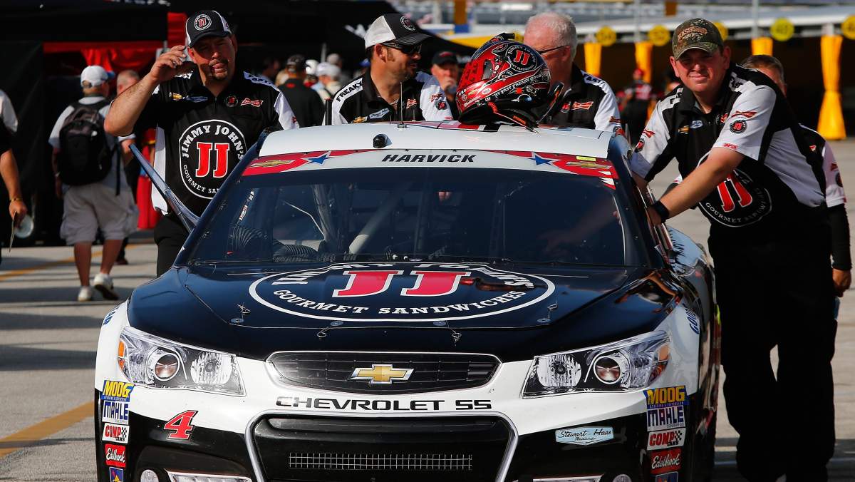 The crew moves Kevin Harvick’s car during practice at Daytona. (Getty)