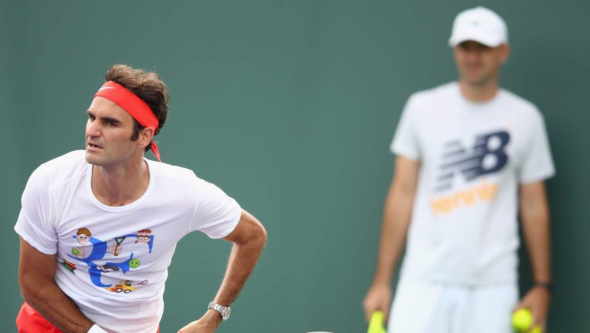 Roger Federer is watched by coach Ivan Ljubicic during a practice session at the Miami Open on March 24, 2016. (Getty)