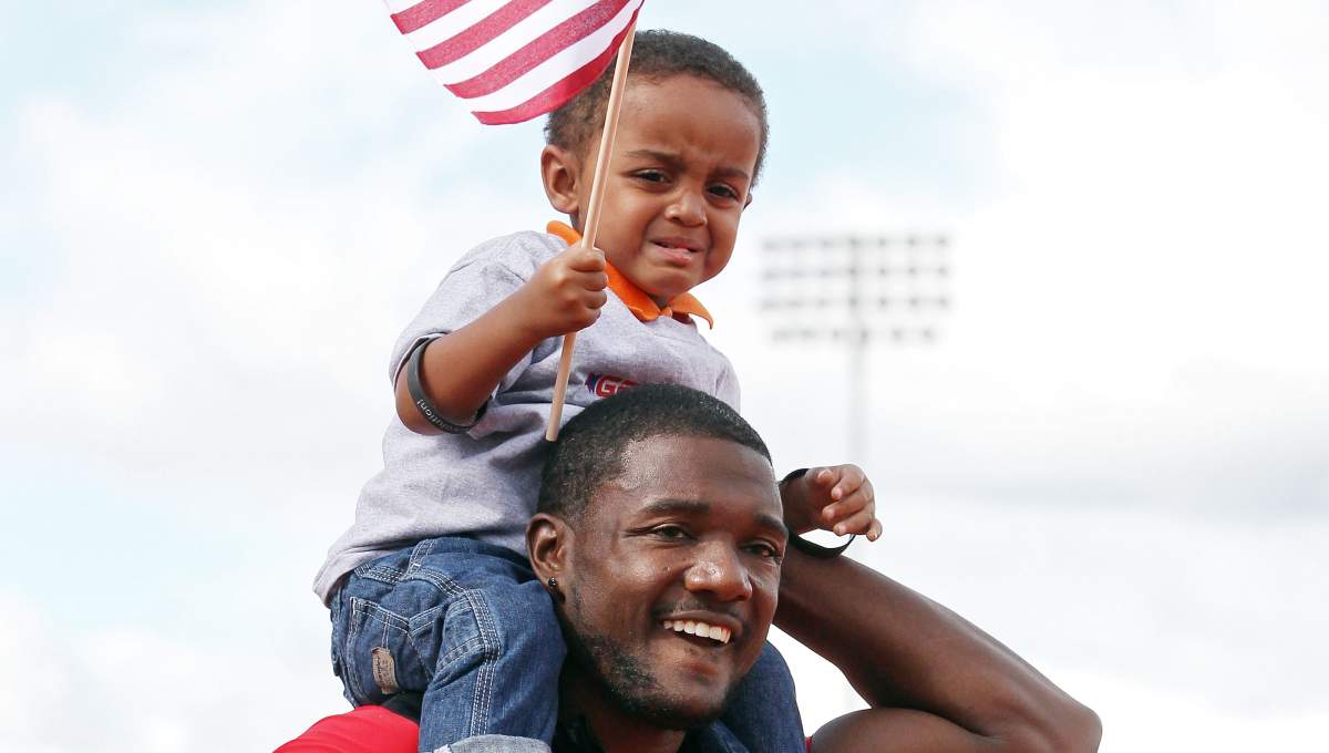 Justin Gatlin celebrates with his son Jace after winning the men’s 100-meter final at the 2012 U.S. Olympic Track & Field Team Trials. (Getty)