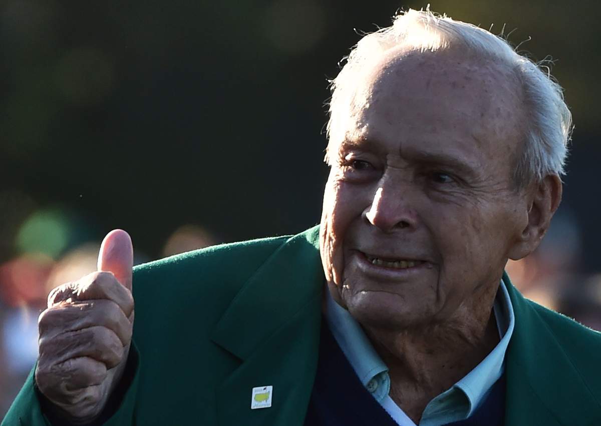 Honorary starter US golfer Arnold Palmer greets fans as he arrives to begin Round 1 of the 80th Masters Golf Tournament at the Augusta National Golf Club on April 7, 2016, in Augusta, Georgia. (Getty)