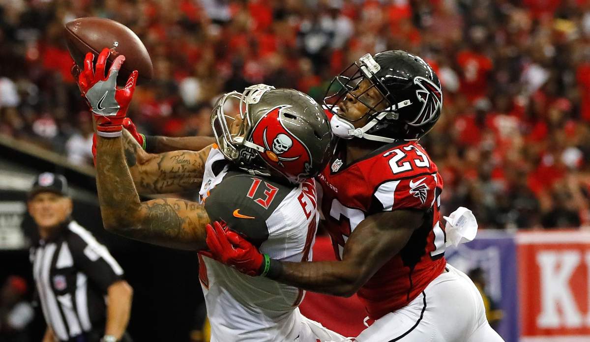 Mike Evans of the Buccaneers pulls in a touchdown reception against the Falcons’ Robert Alford in Week 1. (Getty)