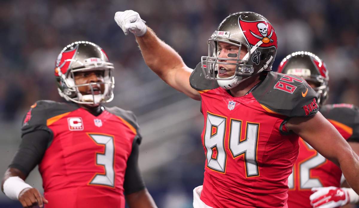 The Buccaneers’ Jameis Winston (3) and Cameron Brate. (Getty)