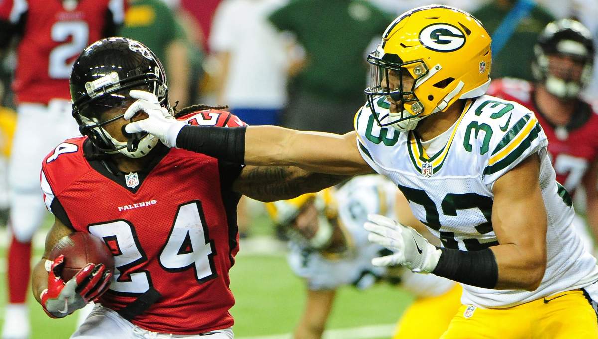 Falcons running back Devonta Freeman tries to escape the tackle attempt by Micah Hyde of the Packers earlier this season. (Getty)