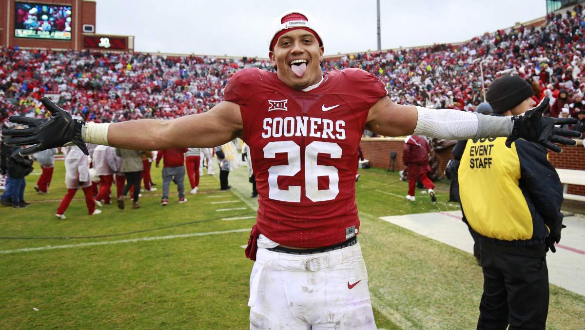 Jordan Evans celebrates after the game against the Oklahoma State Cowboys. (Getty)