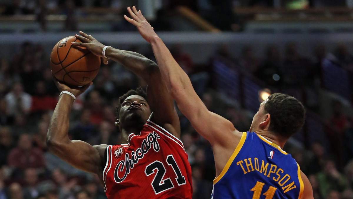 Jimmy Butler of the Chicago Bulls shoots against Klay Thompson of the Golden State Warriors in a game. (Getty)