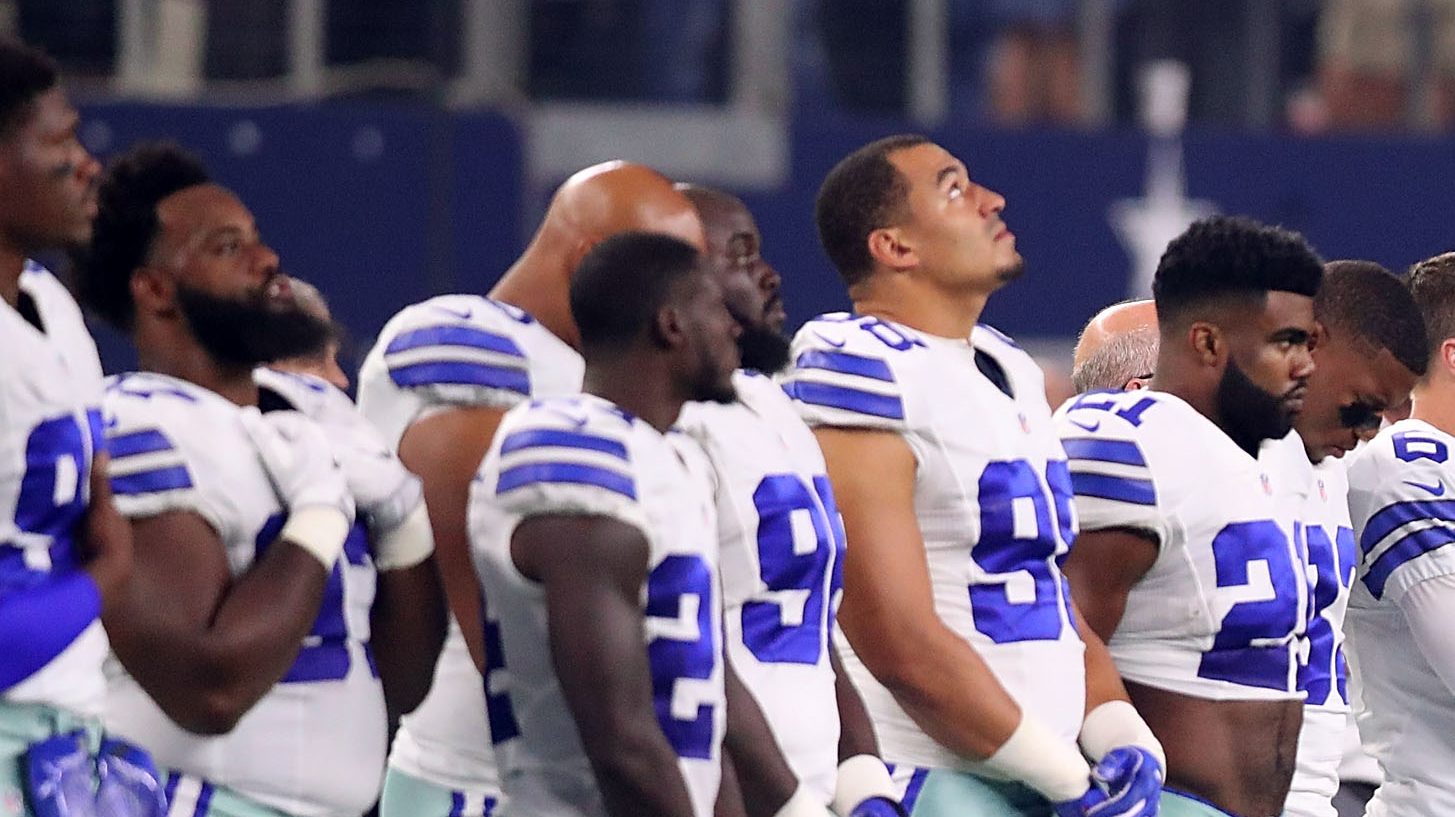 The Cowboys gesture was unique with Jerry Jones joining the team to kneel before the anthem. Jones had previously been outspoken against anthem protests, but viewed this event differently since it was before the flag was displayed.