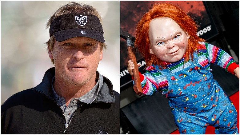 When Gruden returned to coach the Raiders after a long hiatus, Raiders fans dusted off their old Chucky dolls. Now, you can see them all over the Oakland Coliseum at Raiders home games as the fans cheer on their new (old) head coach. The coach’s resemblance to the doll especially comes alive when he gets angry. Gruden has bought into the nickname and even had a Chucky doll in his office when he filmed the popular ESPN series on quarterback prospects.