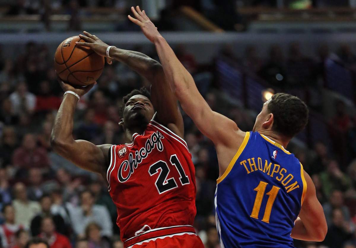 Jimmy Butler of the Chicago Bulls shoots against Klay Thompson of the Golden State Warriors in a game. (Getty)