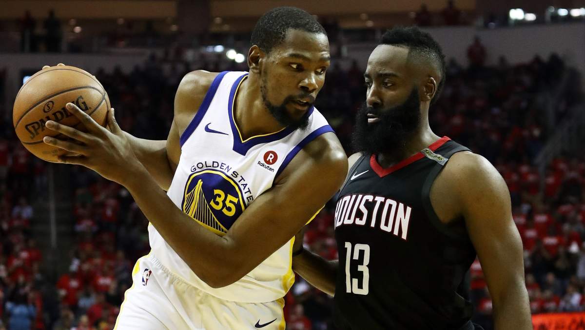 Getty ImagesKevin Durant #35 of the Golden State Warriors is guarded by James Harden #13 of the Houston Rockets