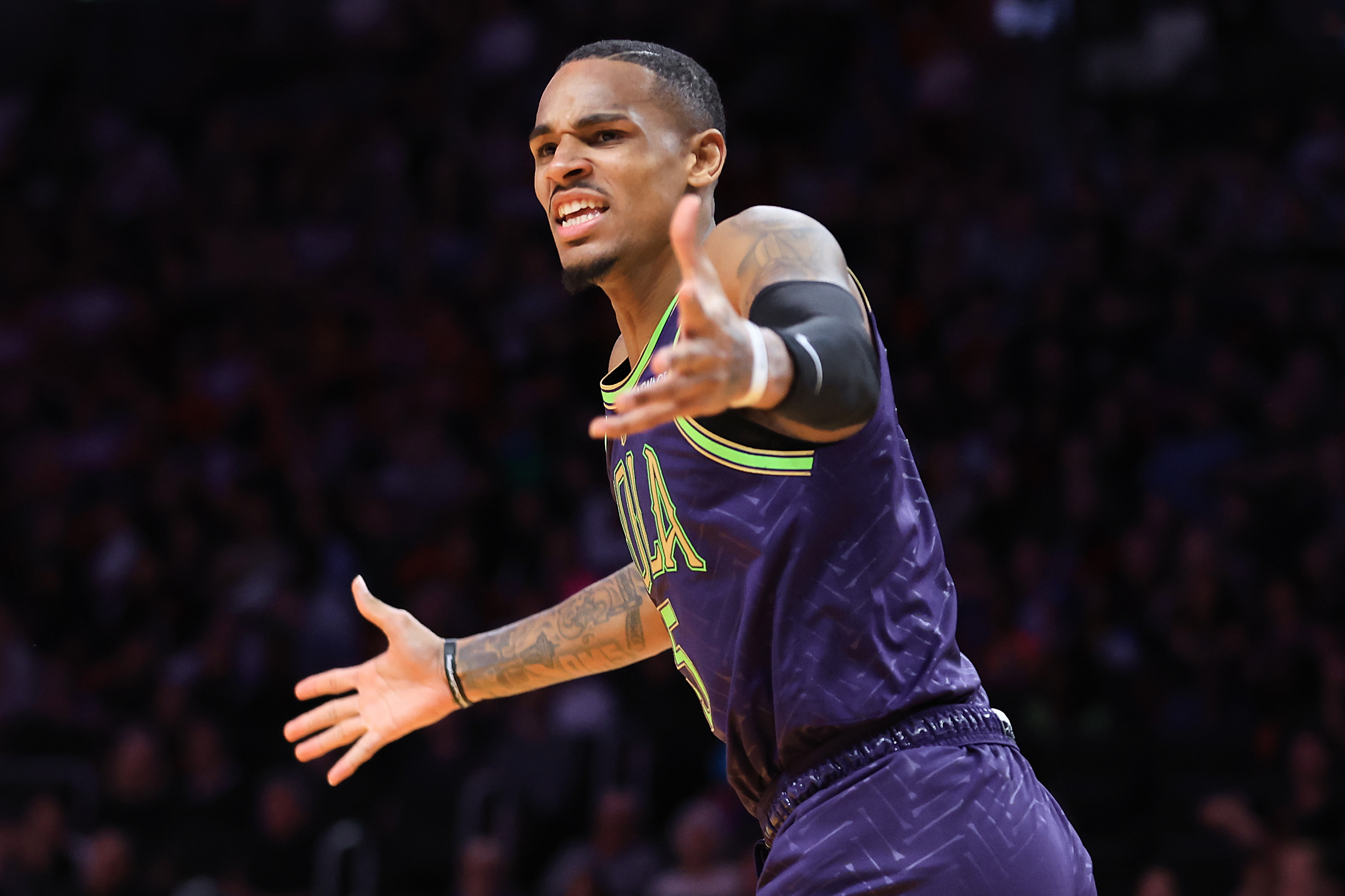 GettyATLANTA, GEORGIA – DECEMBER 2: Dejounte Murray #5 of the New Orleans Pelicans reacts during the third quarter against the Atlanta Hawks at State Farm Arena on December 2, 2024 in Atlanta, Georgia. (Photo by Todd Kirkland/Getty Images)