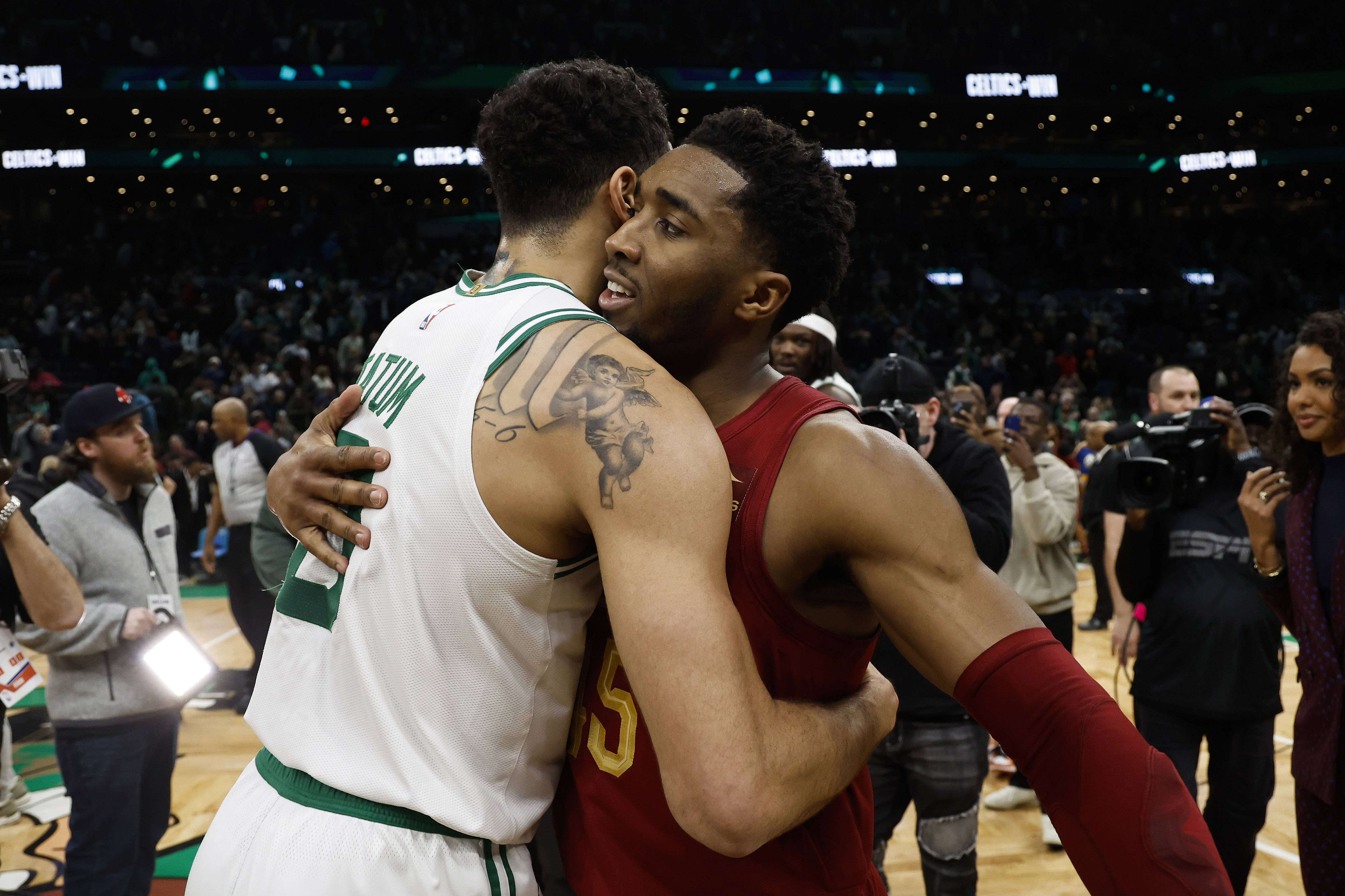 GettyBOSTON, MA – MARCH 1: Jayson Tatum #0 of the Boston Celtics gets a hug from Donovan Mitchell #45 of the Cleveland Cavaliers after their game at TD Garden on March 1, 2023 in Boston, Massachusetts. (Photo By Winslow Townson/Getty Images)