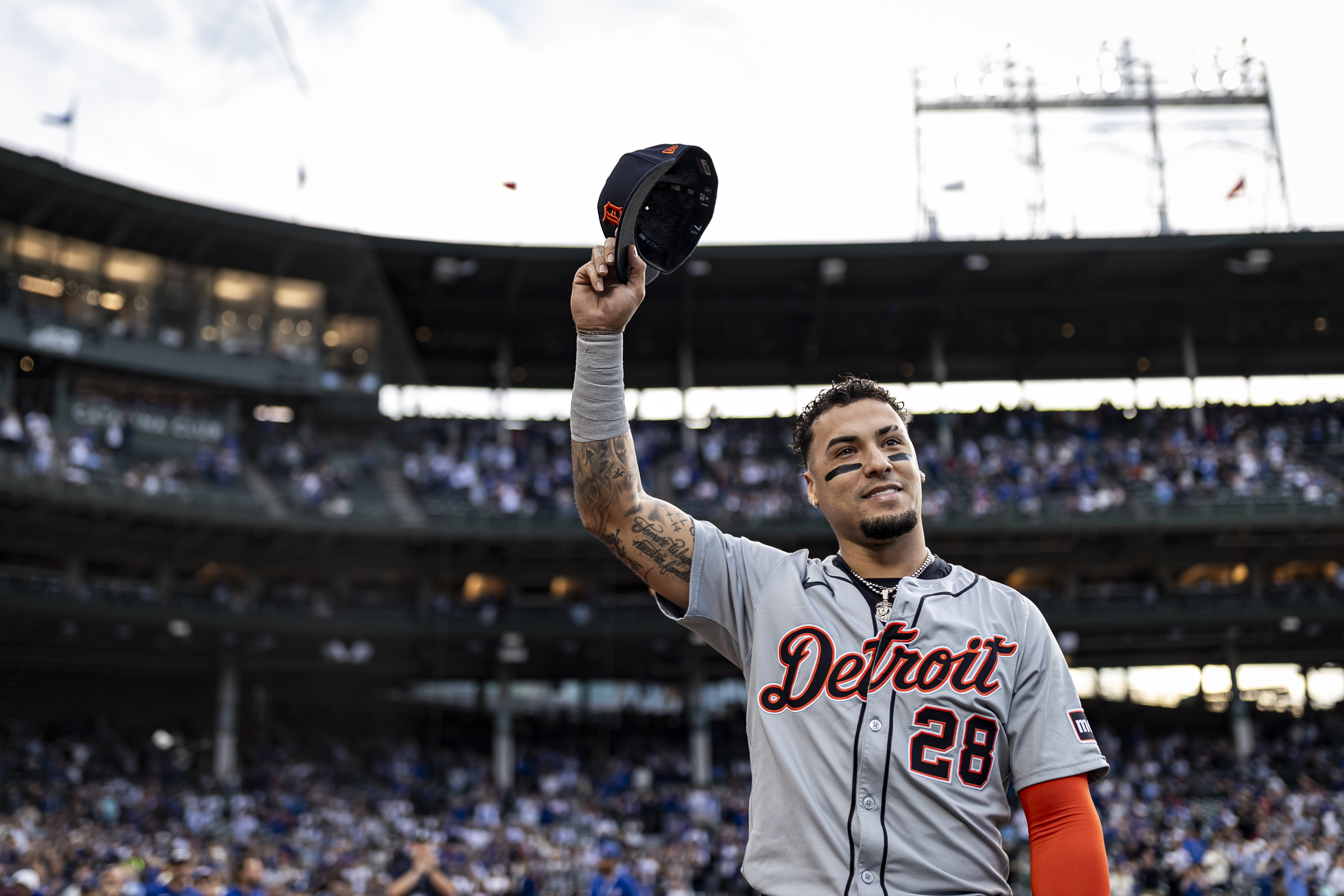 GettyJavier Báez #28 of the Detroit Tigers acknowledges the crowd on his return to Wrigley Field for the first time since his 2021 trade before a game against the Chicago Cubs on August 20, 2024 in Chicago, Illinois.