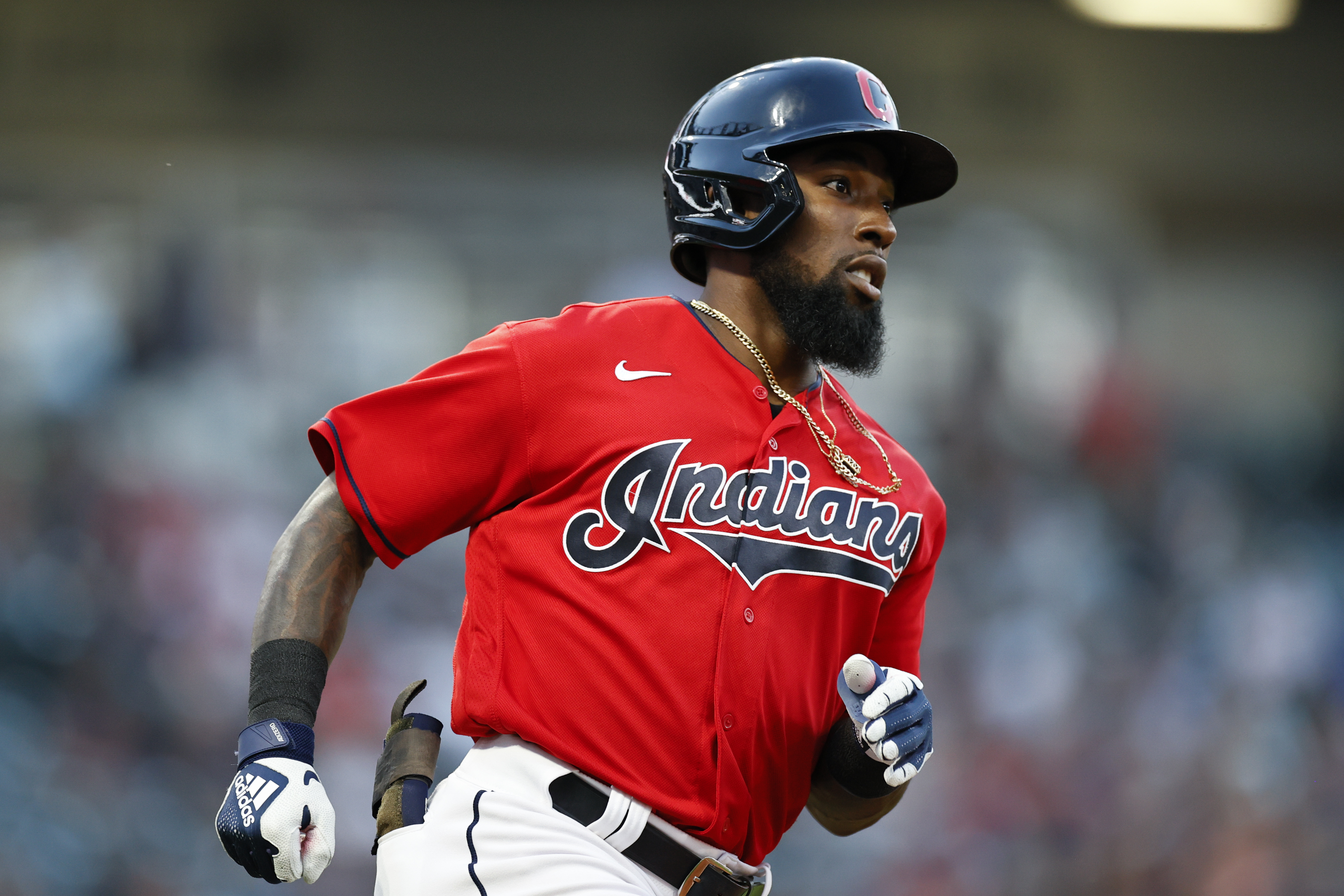 GettyDaniel Johnson #23 of the Cleveland Indians rounds the bases on a solo home run off of Taylor Hearn of the Texas Rangers in the third inning at Progressive Field on August 24, 2021 in Cleveland, Ohio.