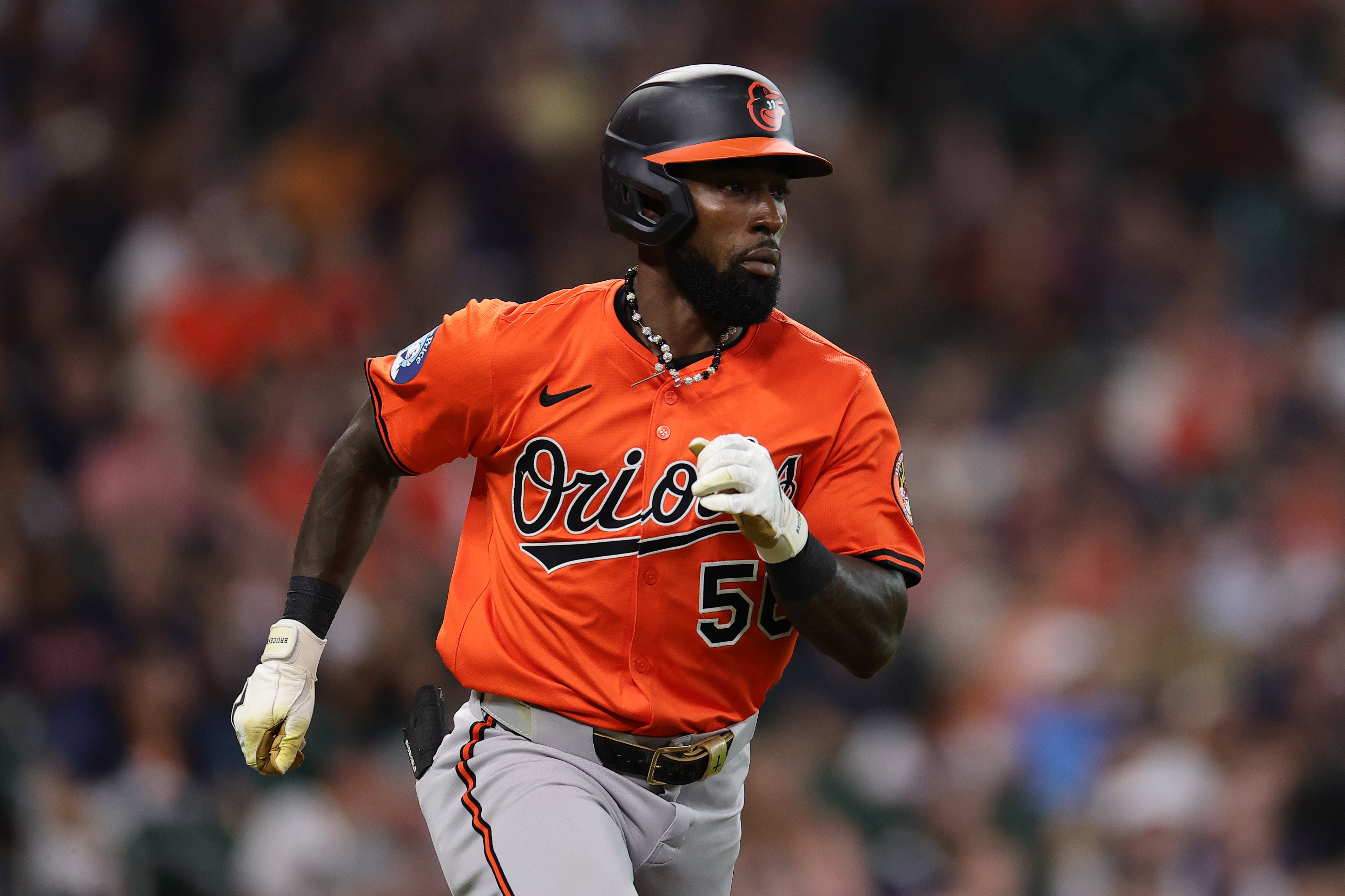 GettyDaniel Johnson #56 of the Baltimore Orioles runs to first base after hitting during the fifth inning against the Houston Astros at Daikin Park on August 16, 2025 in Houston, Texas.