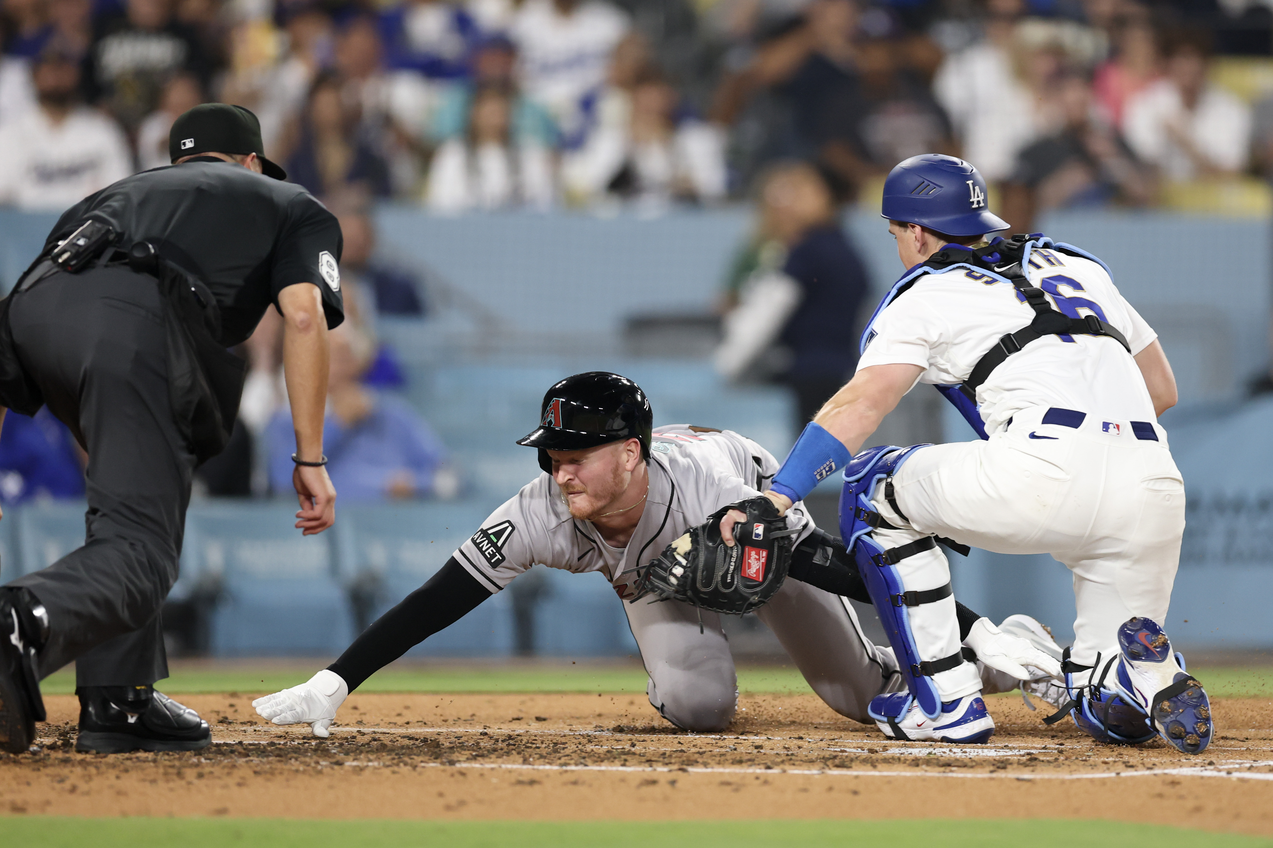 GettyWill Smith #16 of the Los Angeles Dodgers tags out Pavin Smith #26 of the Arizona Diamondbacks at home plate during the second inning of a game at Dodger Stadium on March 27, 2026 in Los Angeles, California.