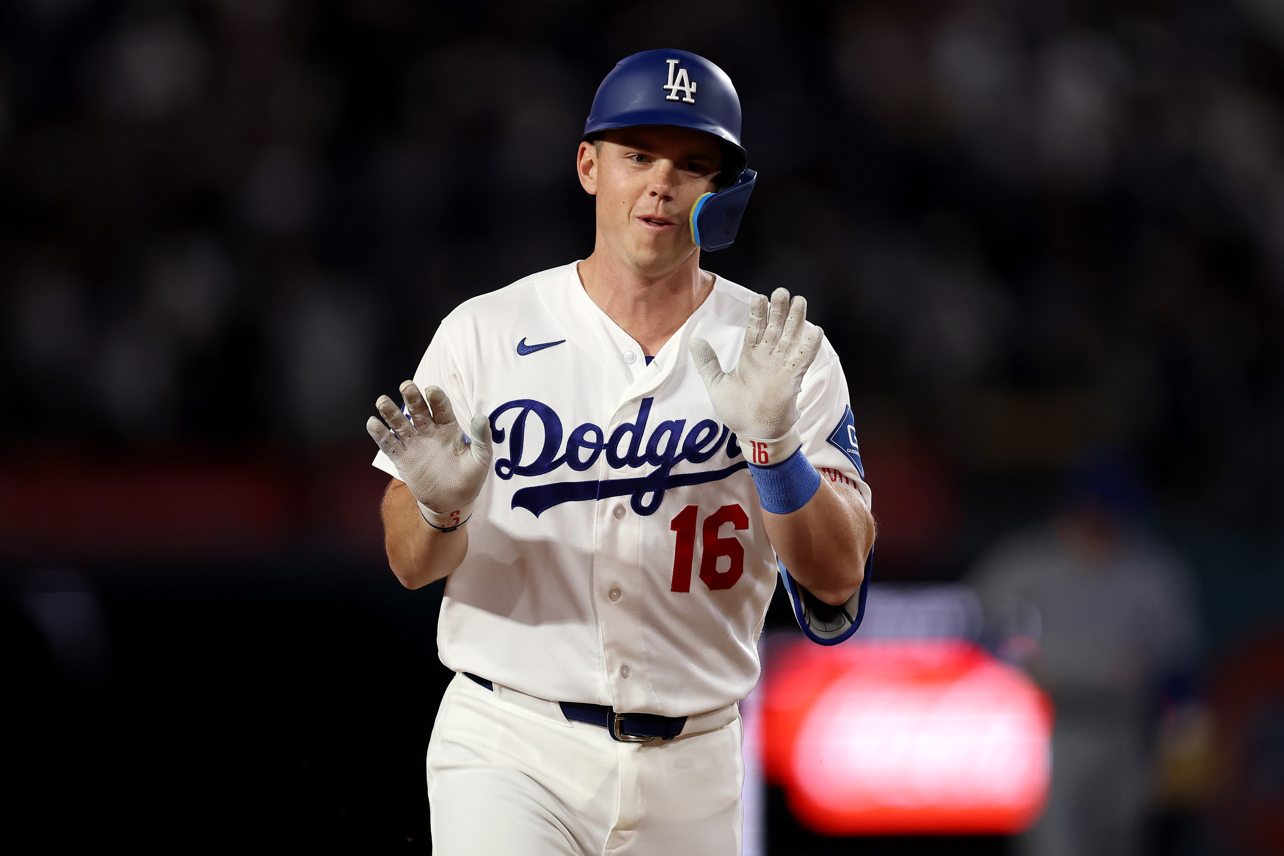 GettyWill Smith #16 of the Los Angeles Dodgers reacts after hitting a three-run home run against the Chicago Cubs during the third inning at Dodger Stadium on April 24, 2026 in Los Angeles, California.