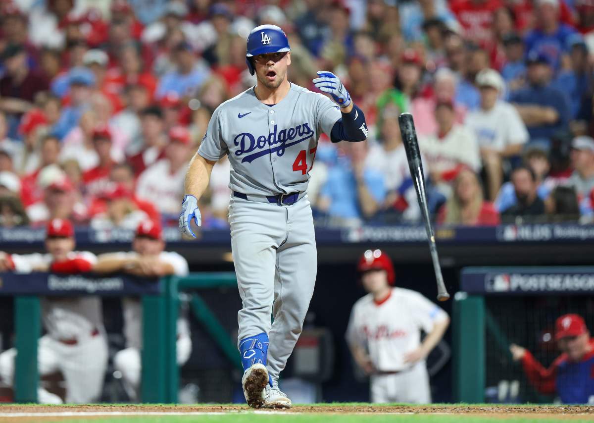 GettyPHILADELPHIA, PENNSYLVANIA – OCTOBER 04: Ben Rortvedt #47 of the Los Angeles Dodgers takes a base after being hit by a pitch in the third inning against the Philadelphia Phillies in game one of the Division Series at Citizens Bank Park on October 04, 2025 in Philadelphia, Pennsylvania. (Photo by Emilee Chinn/Getty Images)
