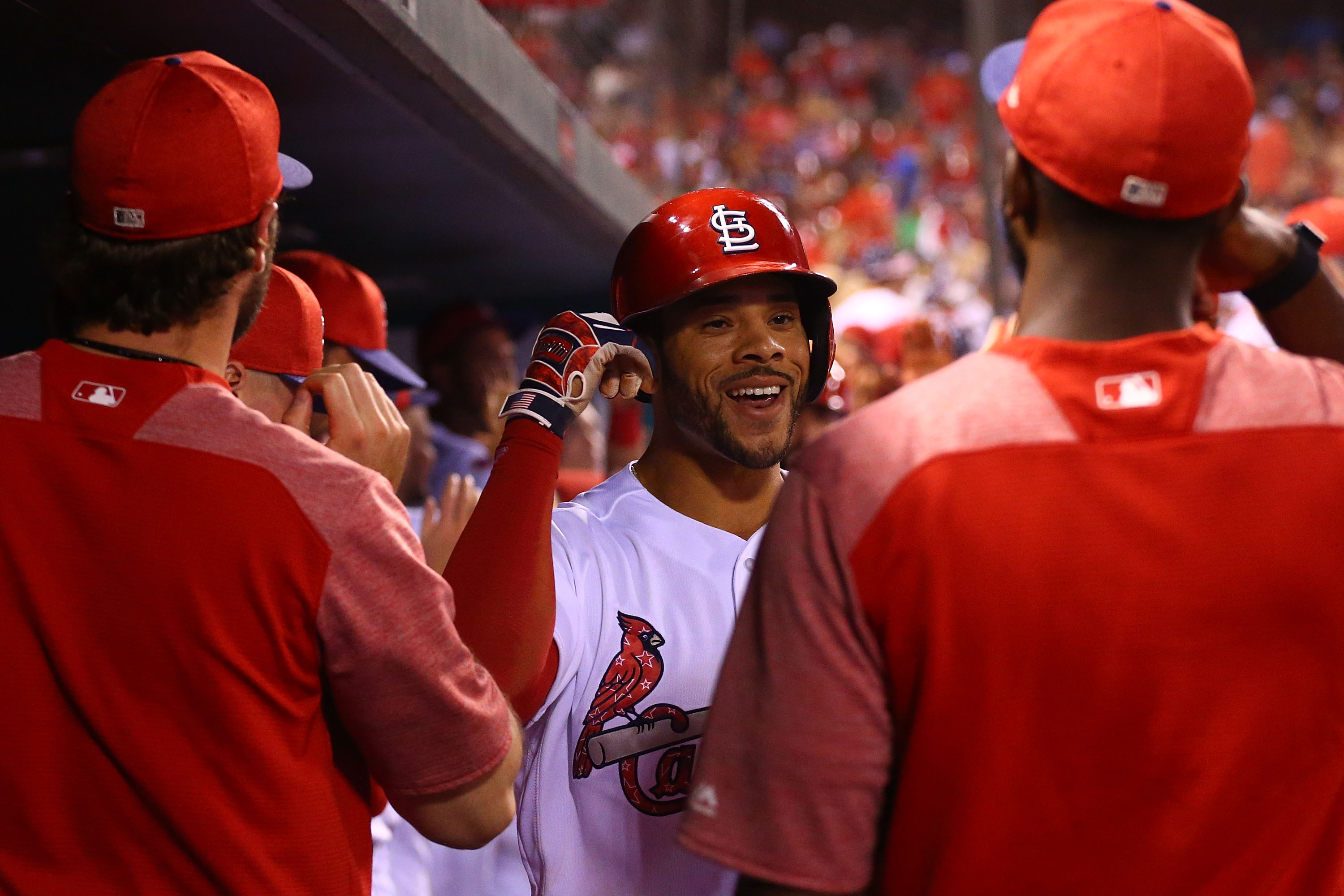GettyST. LOUIS, MO – JULY 2: Tommy Pham #28 of the St. Louis Cardinals is congratulated after hitting a two-run home run against the Washington Nationals in the eighth inning at Busch Stadium on July 2, 2017 in St. Louis, Missouri. (Photo by Dilip Vishwanat/Getty Images)