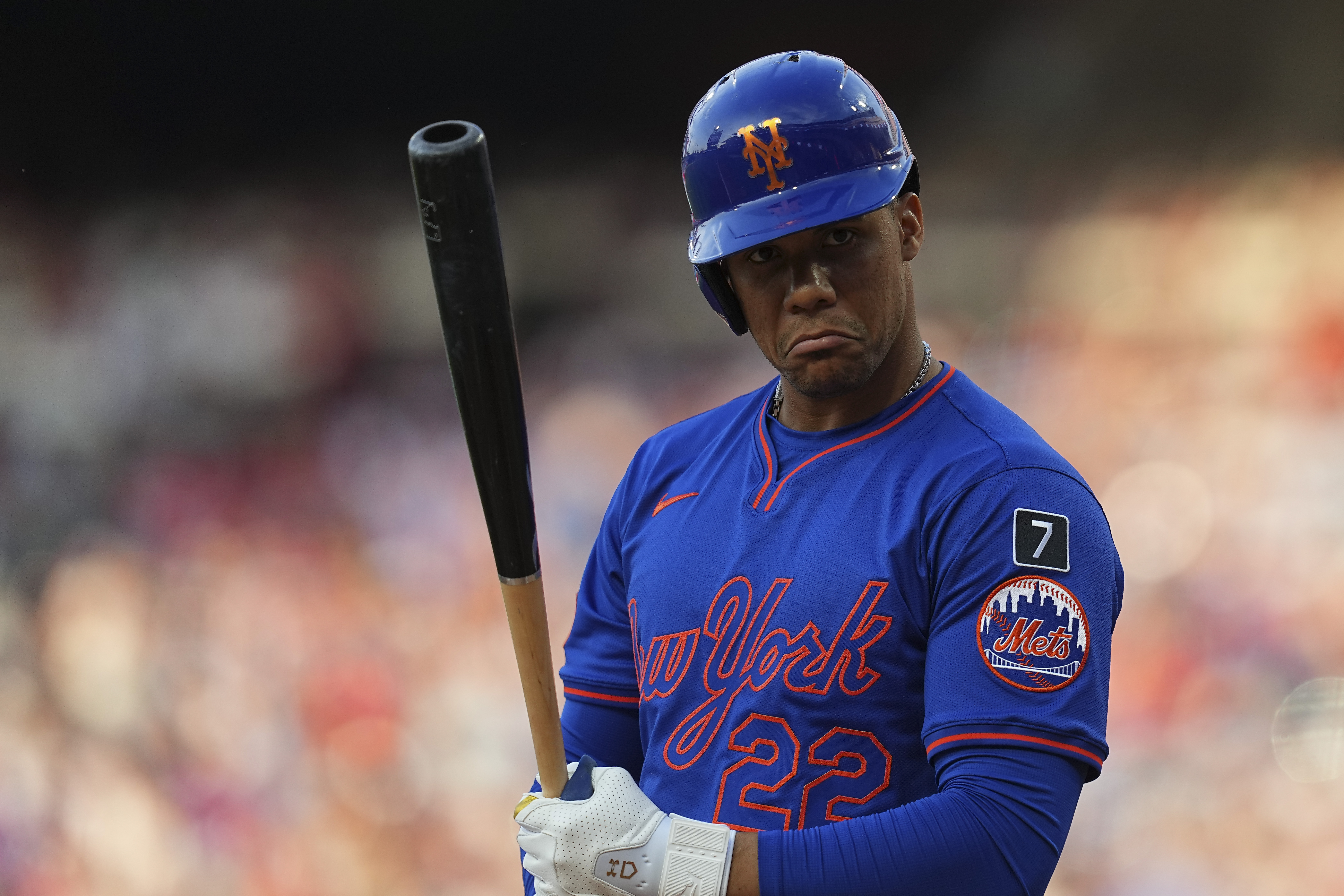 GettyJuan Soto #22 of the New York Mets reacts in the top of the first inning against the Philadelphia Phillies at Citizens Bank Park on June 21, 2025 in Philadelphia, Pennsylvania.