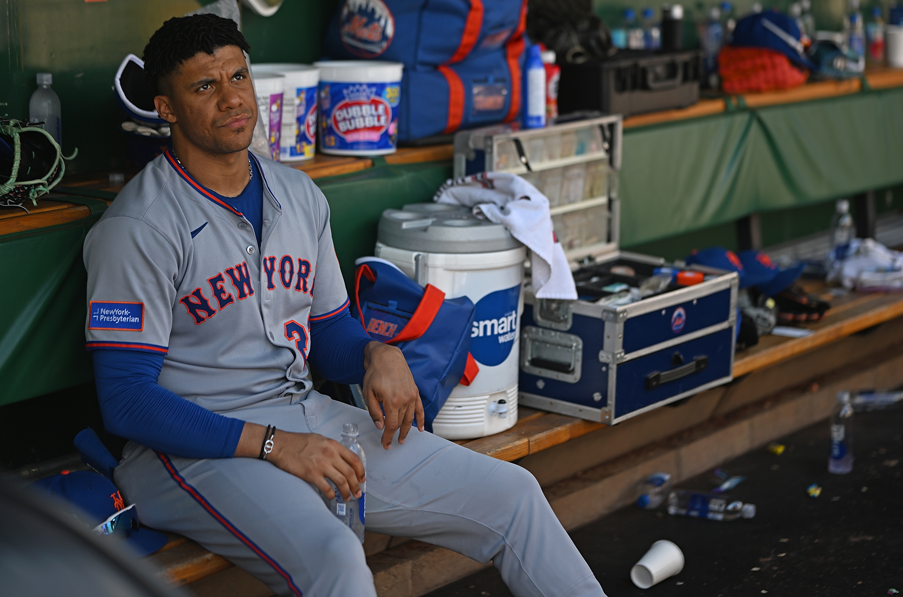 GettyJuan Soto #22 of the New York Mets looks on from the dugout in the seventh inning during the game against the Pittsburgh Pirates at PNC Park on June 29, 2025 in Pittsburgh, Pennsylvania.