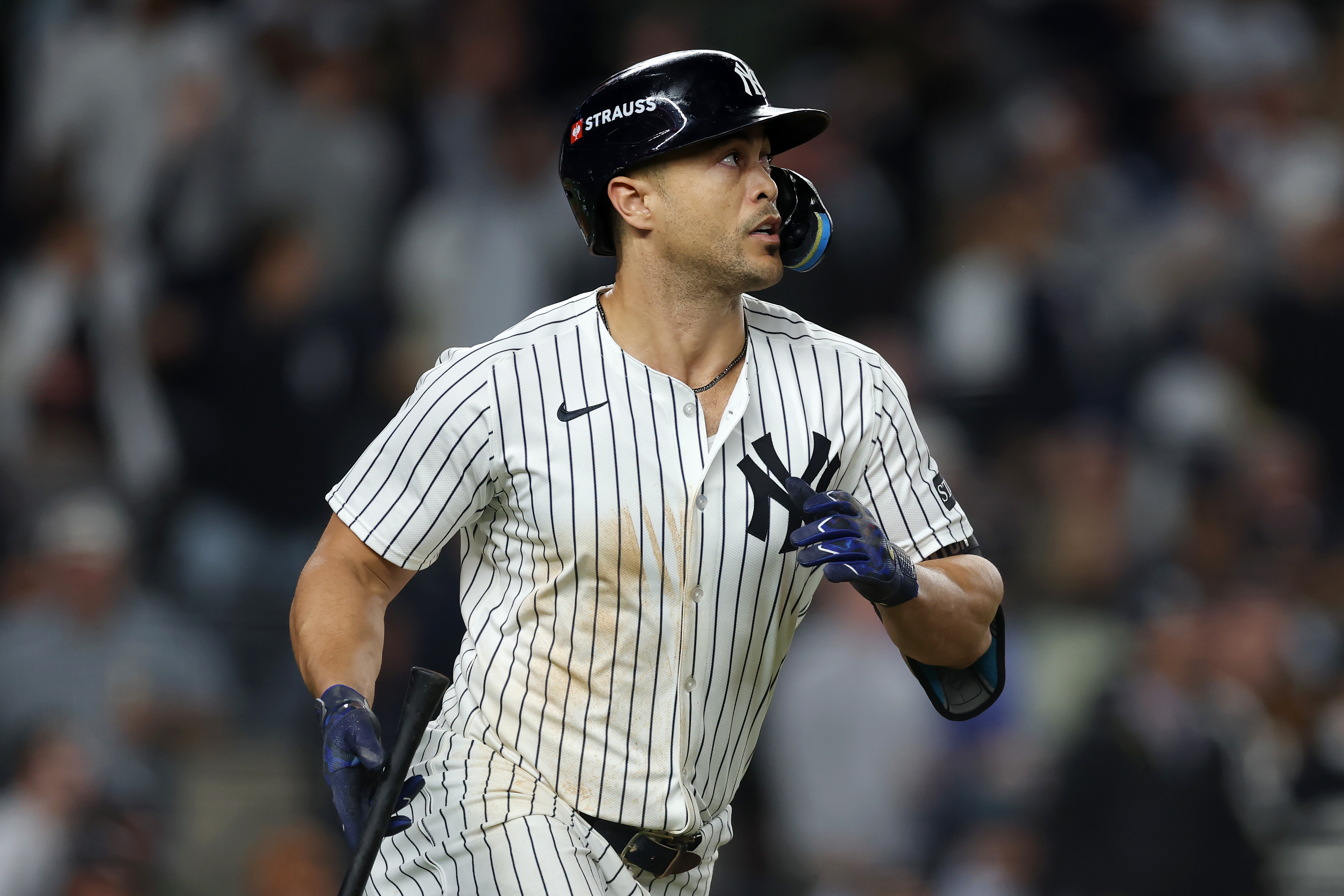 GettyGiancarlo Stanton #27 of the New York Yankees reacts in the dugout after a solo home run during the second inning against the Houston Astros at Daikin Park on September 03, 2025 in Houston, Texas.