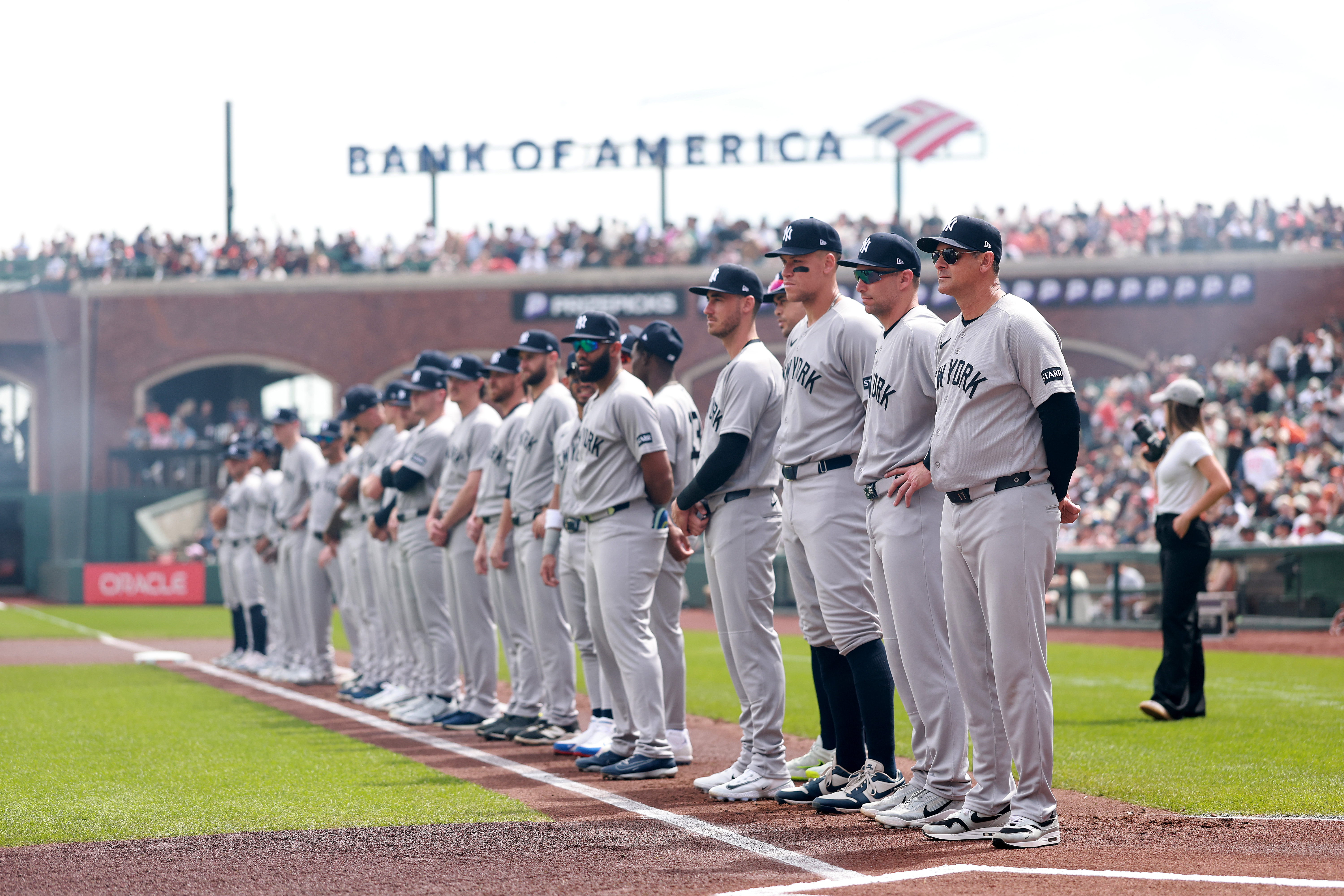GettyManager Aaron Boone #17 of the New York Yankees stands with his team before their game against the San Francisco Giants at Oracle Park on March 27, 2026 in San Francisco, California.