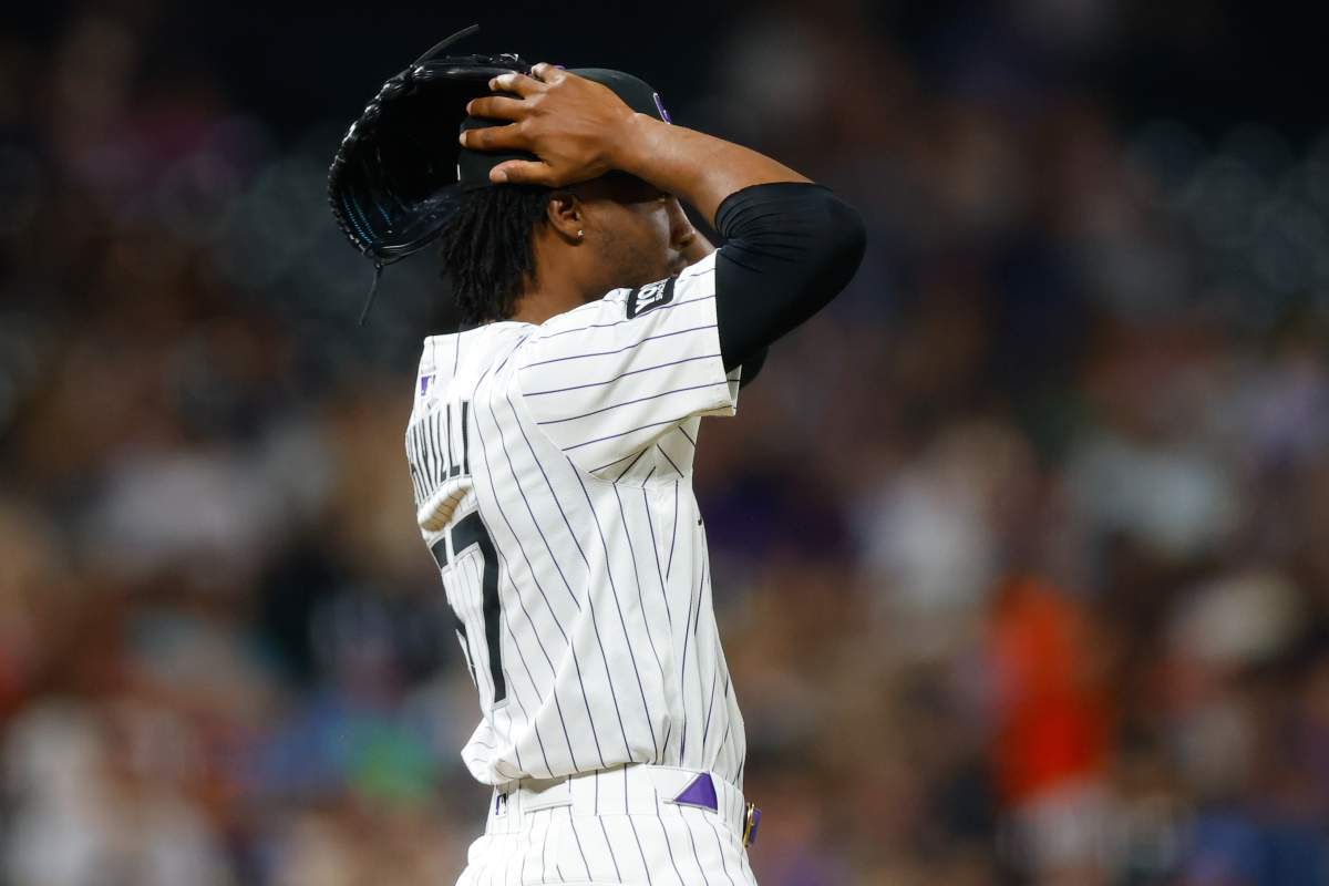 DENVER, CO - SEPTEMBER 2: Relief pitcher Angel Chivilli #57 of the Colorado Rockies reacts after giving up a two run home run to Wilmer Flores of the San Francisco Giants in the fifth inning against the San Francisco Giants at Coors Field on September 2, 2025 in Denver, Colorado. (Photo by Justin Edmonds/Getty Images)