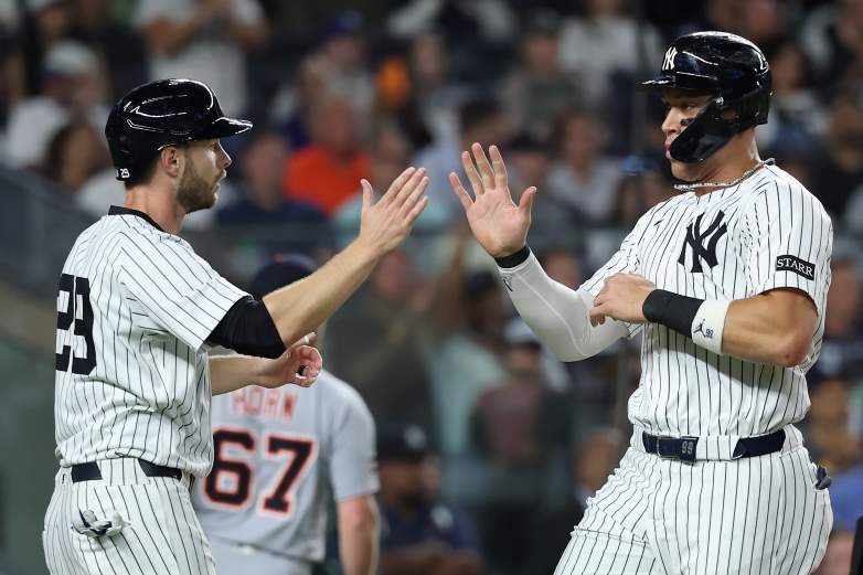 GettyNEW YORK, NEW YORK – SEPTEMBER 11: Aaron Judge #99 of the New York Yankees celebrates with Austin Slater #29 after scoring a run during the fourth inning against the Detroit Tigers at Yankee Stadium on September 11, 2025, in the Bronx borough of New York City. Members of the New York Yankees were given permission by MLB to wear FDNY and NYPD hats tonight, honoring the fallen first responders of 9/11. (Photo by Elsa/Getty Images)