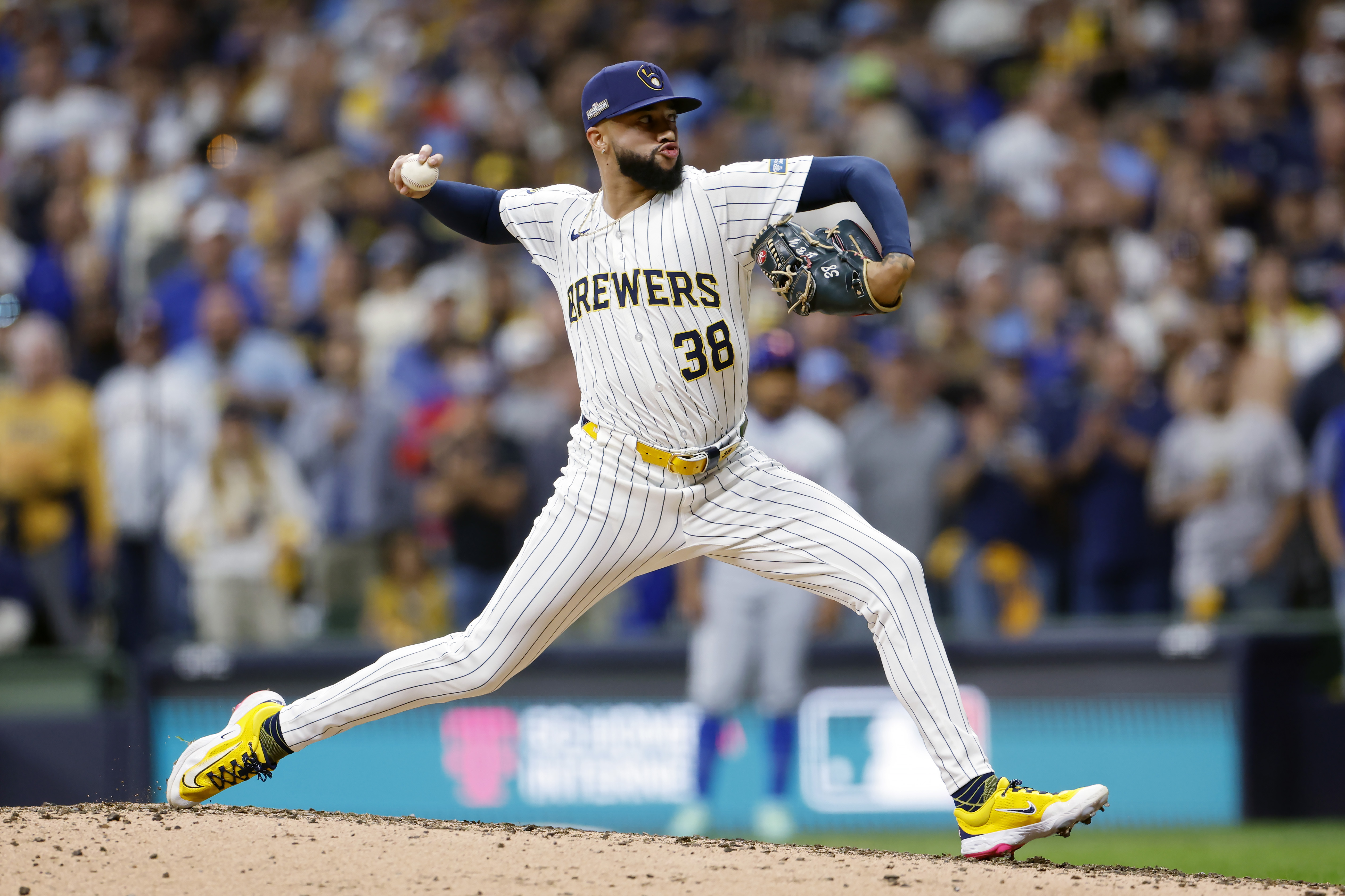 GettyDevin Williams #38 of the Milwaukee Brewers pitches in the ninth inning against the New York Mets during Game Three of the Wild Card Series at American Family Field on October 03, 2024 in Milwaukee, Wisconsin.