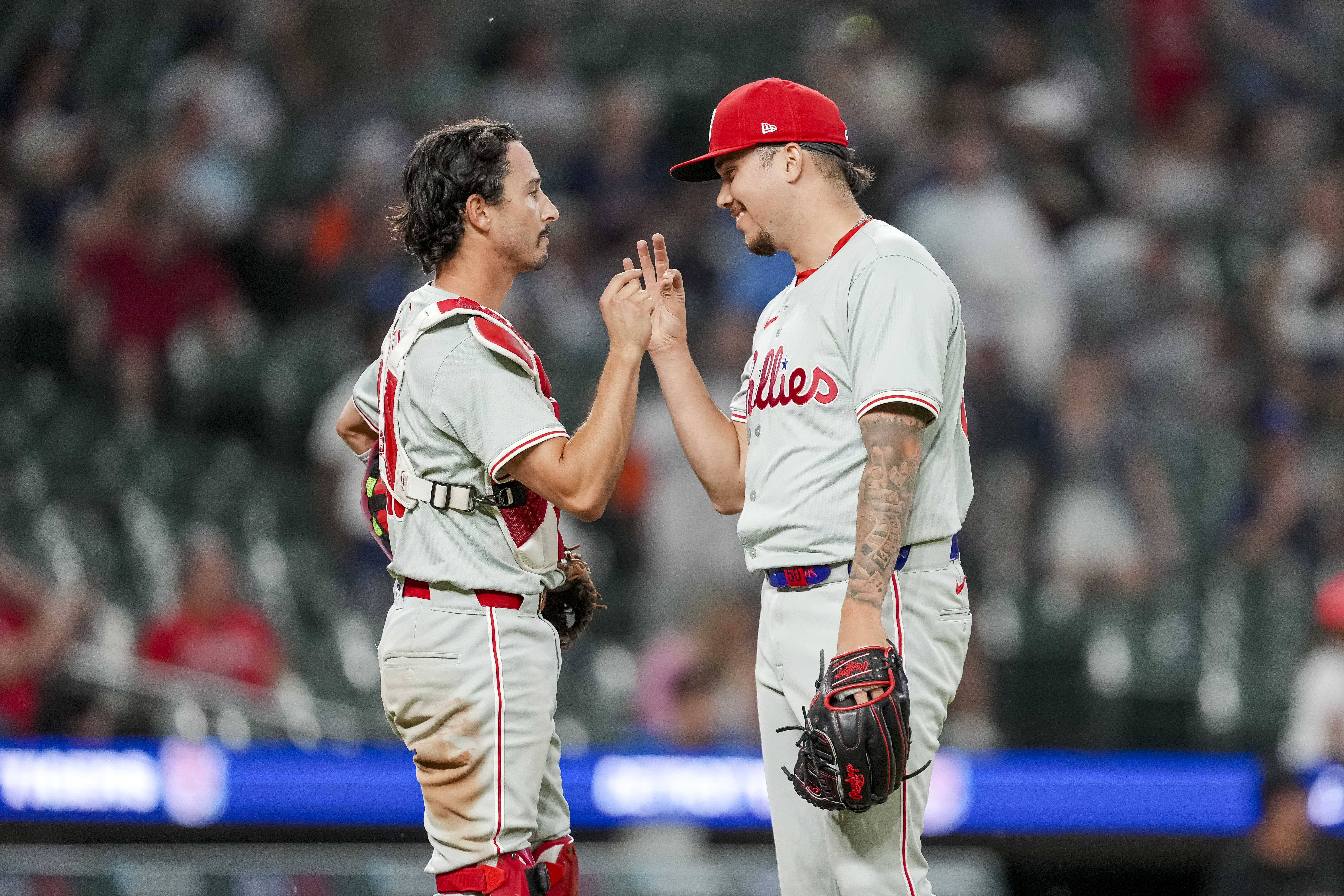 GettyDETROIT, MICHIGAN – JUNE 24: Garrett Stubbs #21 of the Philadelphia Phillies and Orion Kerkering #50 of the Philadelphia Phillies celebrate their win against the Detroit Tigers at Comerica Park on June 24, 2024 in Detroit, Michigan. (Photo by Nic Antaya/Getty Images)