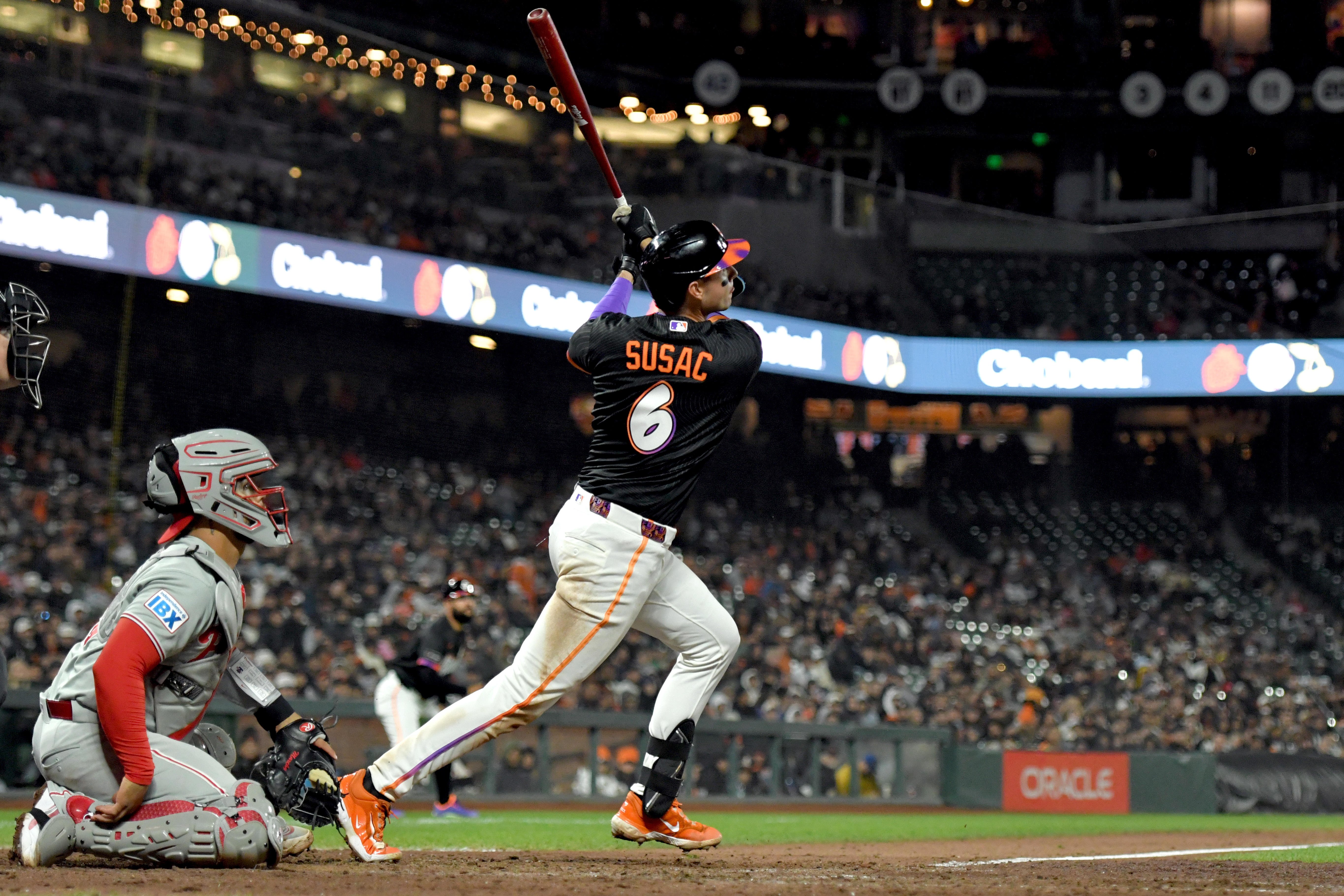 GettyDaniel Susac of the San Francisco Giants hits a triple against the Philadelphia Phillies.