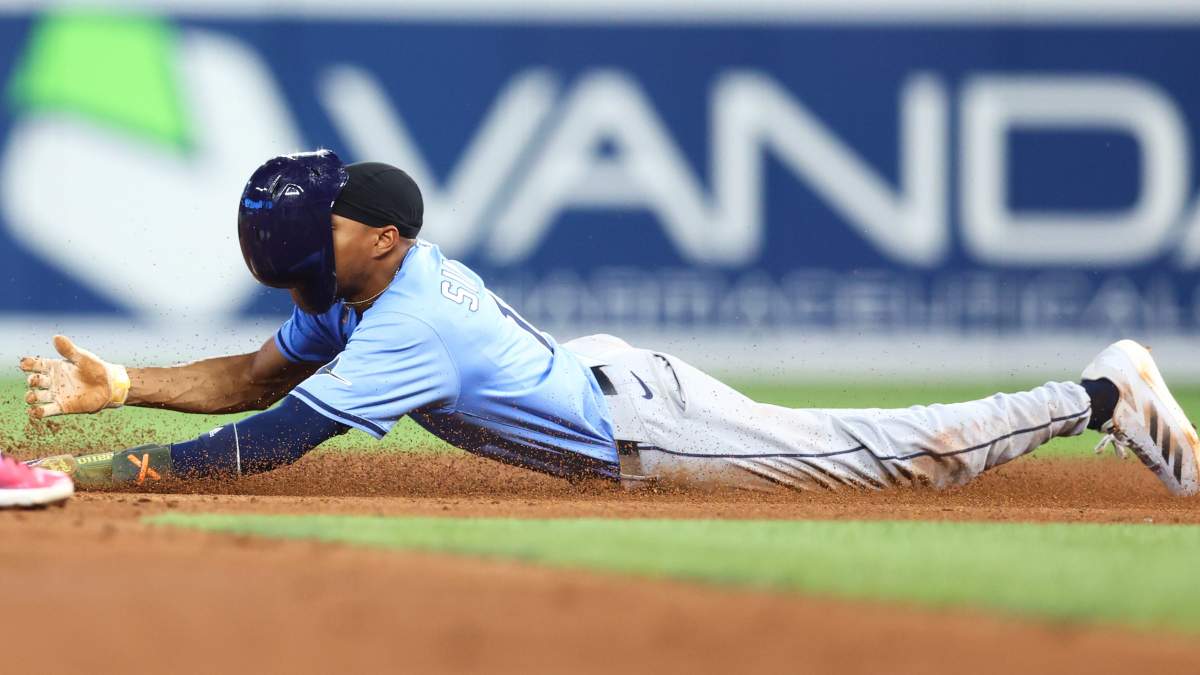 As Kameron Misner stood at the plate, Simpson took off for second base on the third pitch of the at-bat, and narrowly beat out the tag by Jose Altuve. Had the Astros used their challenge, the safe call may have been overturned. Nevertheless, Simpson was undeterred, and two pitches later set off for third. The throw from Astros catcher Yainer Diaz was wide of third baseman (and former Ray) Isaac Paredes, and flew into left field; Simpson had time to comfortably pick himself up and head for home.