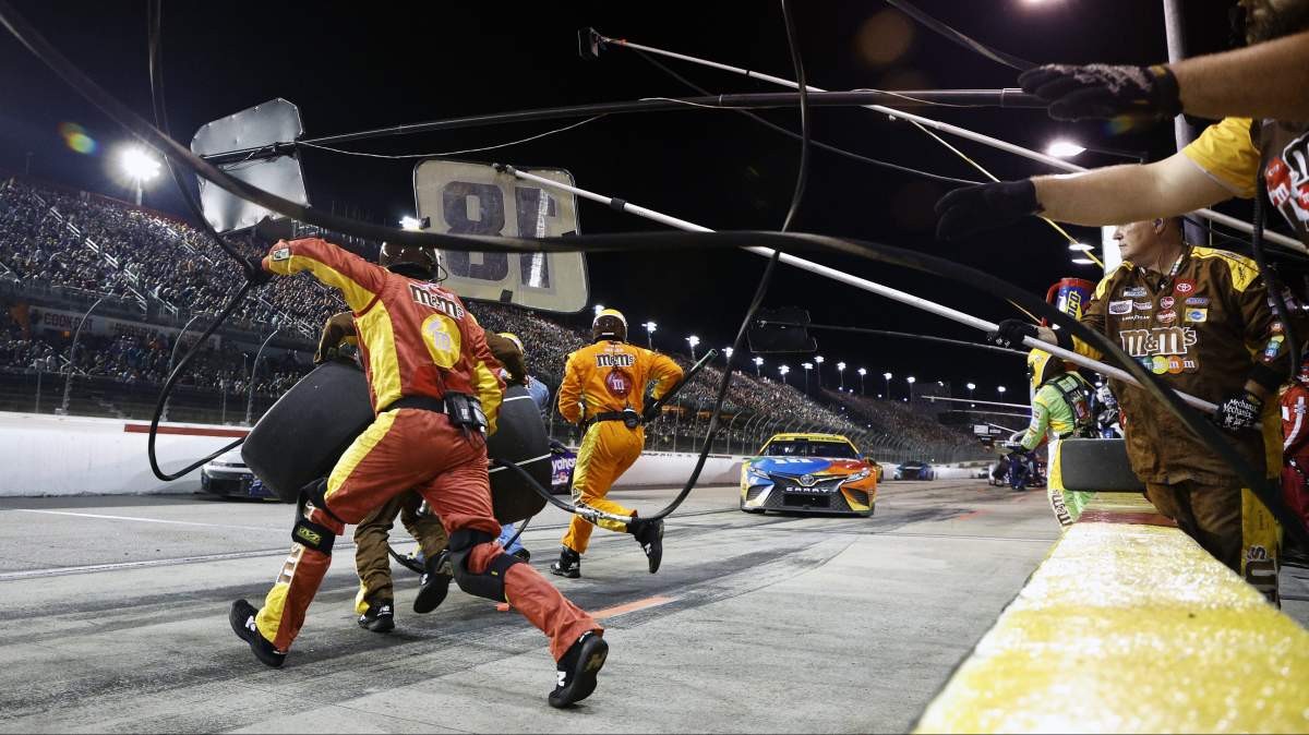 GettyKyle Busch’s team makes a pit stop at Richmond Raceway.
