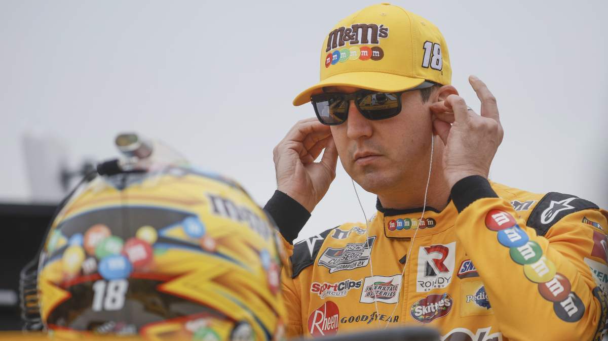 GettyKyle Busch speaks to the media at Kansas Speedway.