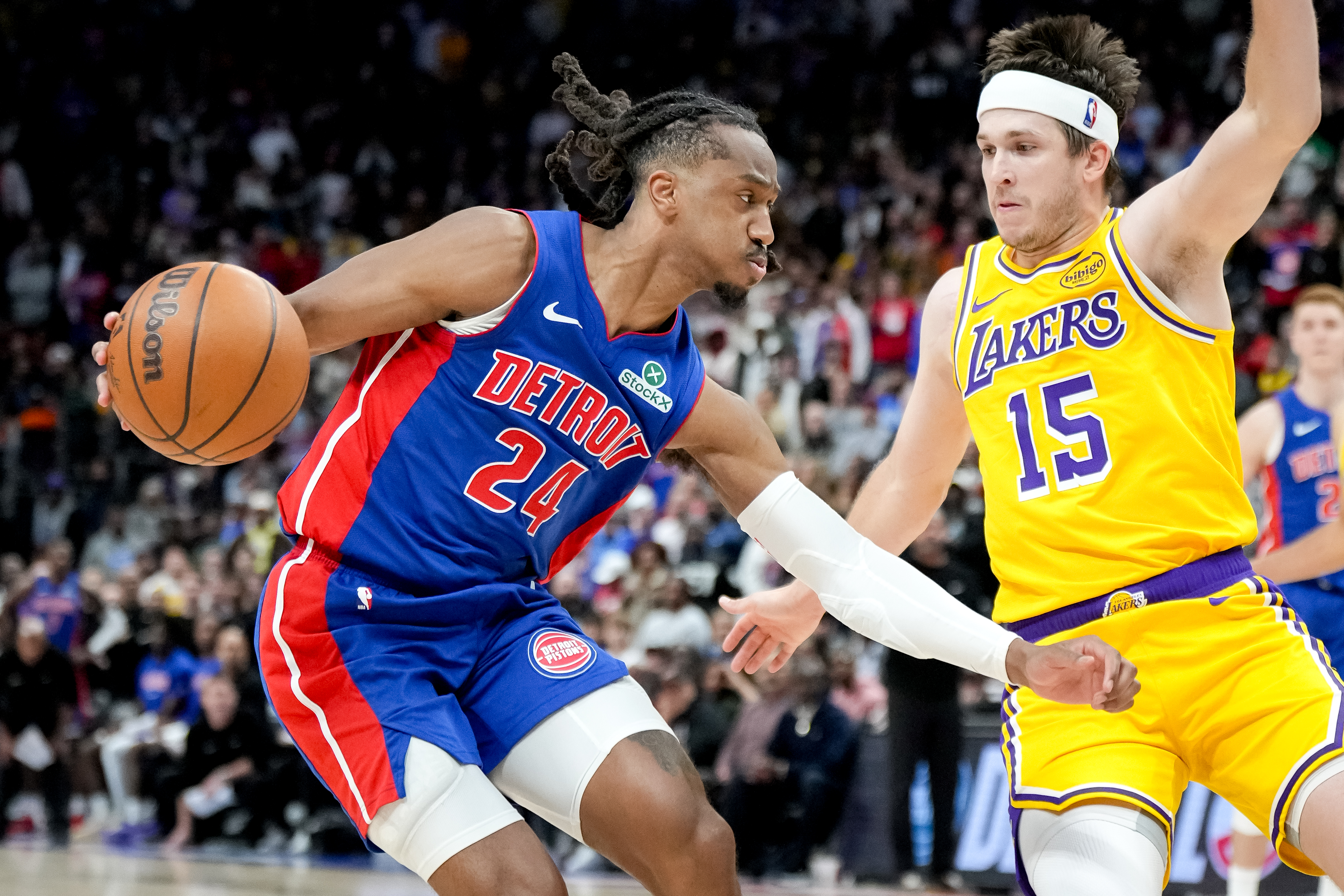 GettyDETROIT, MICHIGAN – MARCH 23: Daniss Jenkins #24 of the Detroit Pistons dribbles the ball against Austin Reaves #15 of the Los Angeles Lakers during the fourth quarter at Little Caesars Arena on March 23, 2026 in Detroit, Michigan. (Photo by Nic Antaya/Getty Images)