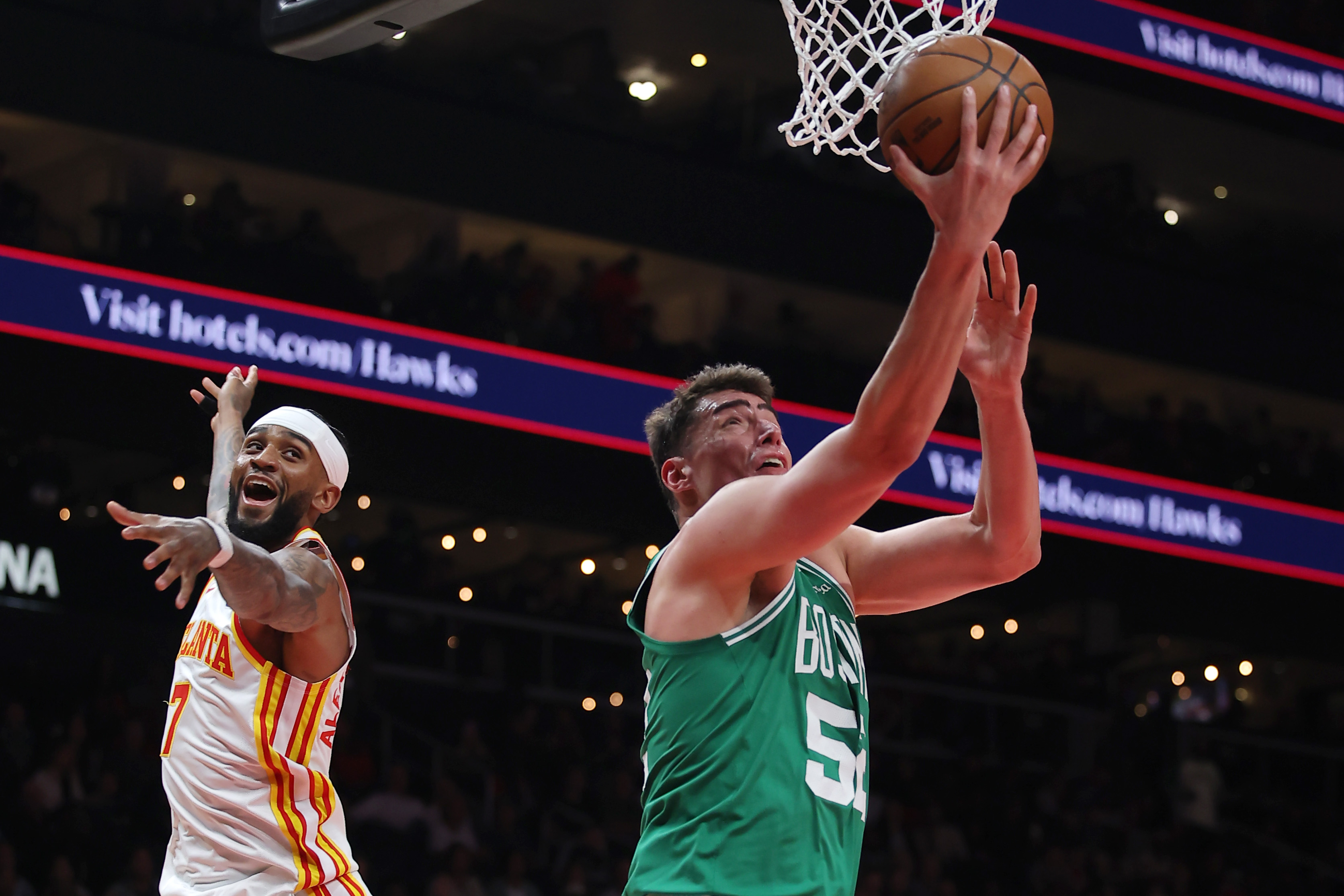 GettyATLANTA, GEORGIA – MARCH 30: Luka Garza #52 of the Boston Celtics lays up a shot against Nickeil Alexander-Walker #7 of the Atlanta Hawks in the first half at State Farm Arena on March 30, 2026 in Atlanta, Georgia. (Photo by Jonathan Bachman/Getty Images)