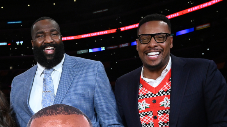 Boston Celtics alums Kendrick Perkins and Paul Pierce poses before a game.