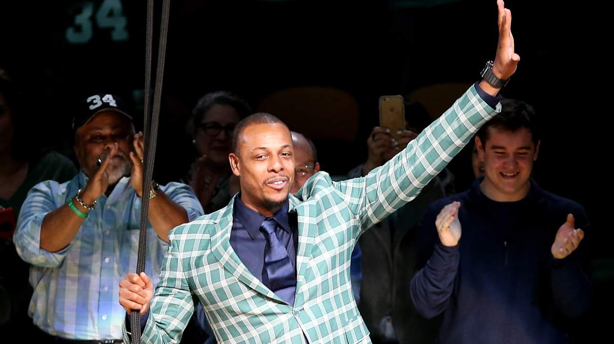 One of the uneasy fans has his retired No. 34 hanging from the TD Garden rafters.