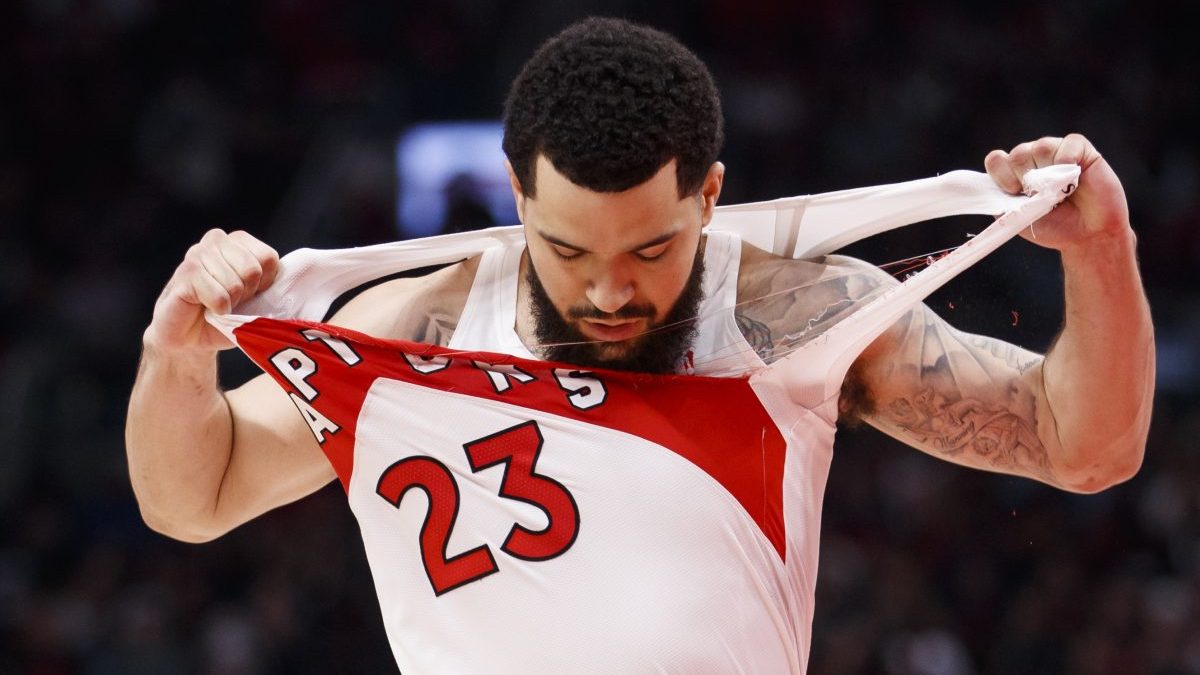 Fred VanVleet #23 of the Toronto Raptors rips his jersey.