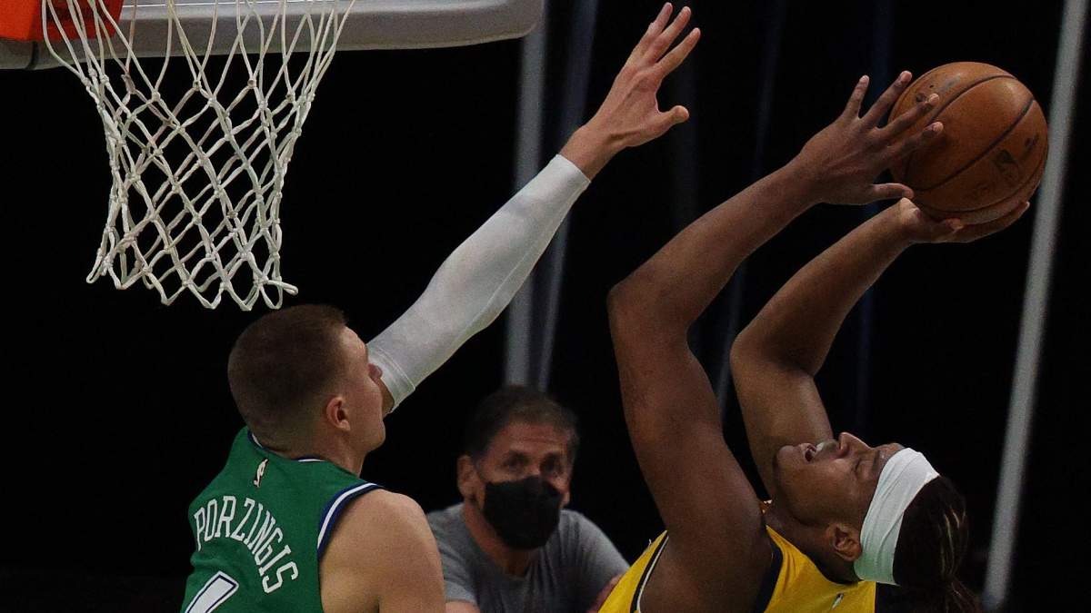Myles Turner challanges Kristaps Porzingis at the rim.