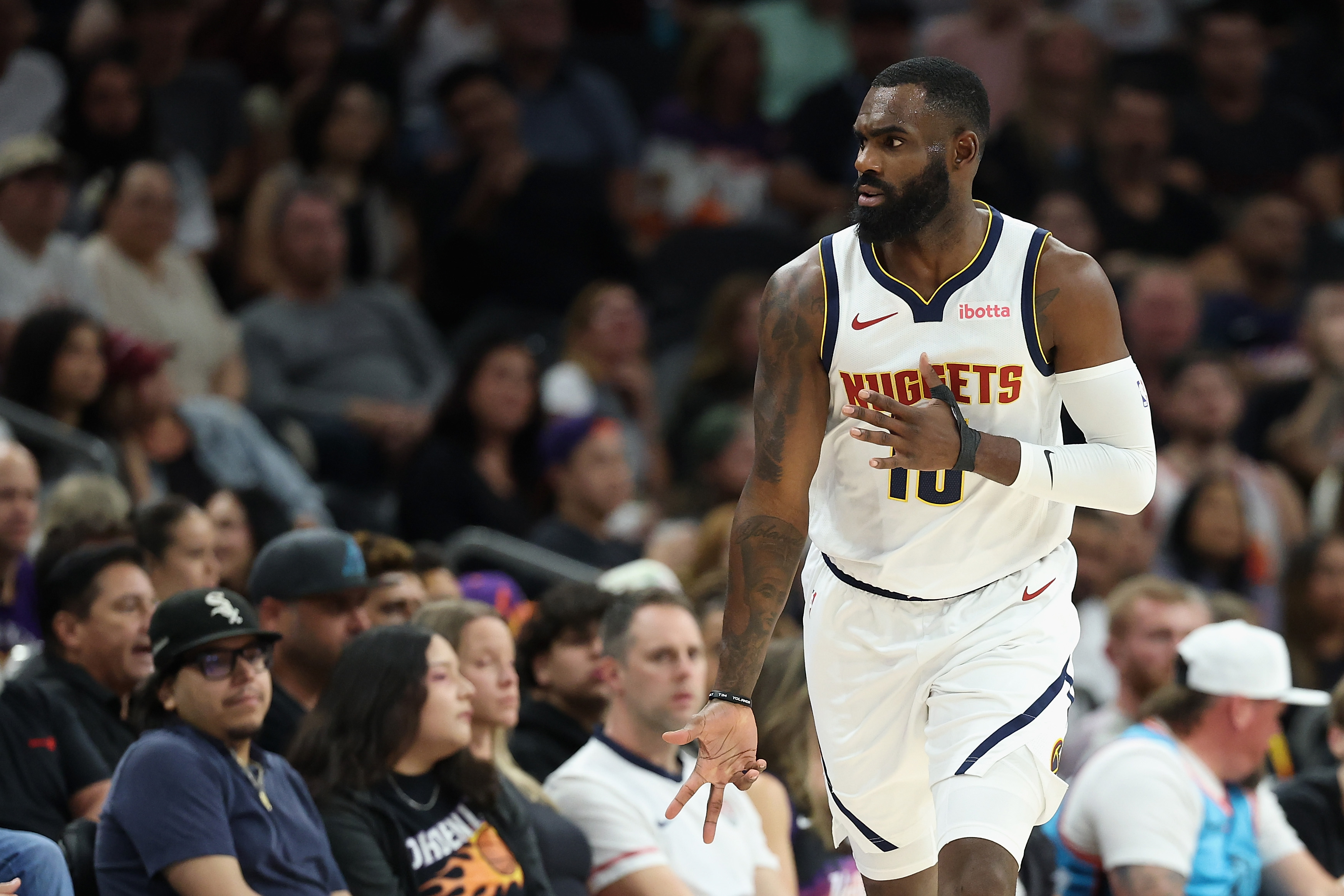 GettyTim Hardaway Jr. #10 of the Denver Nuggets reacts to a three-point shot against the Phoenix Suns during the first half of the NBA game at Mortgage Matchup Center on March 24, 2026 in Phoenix, Arizona.